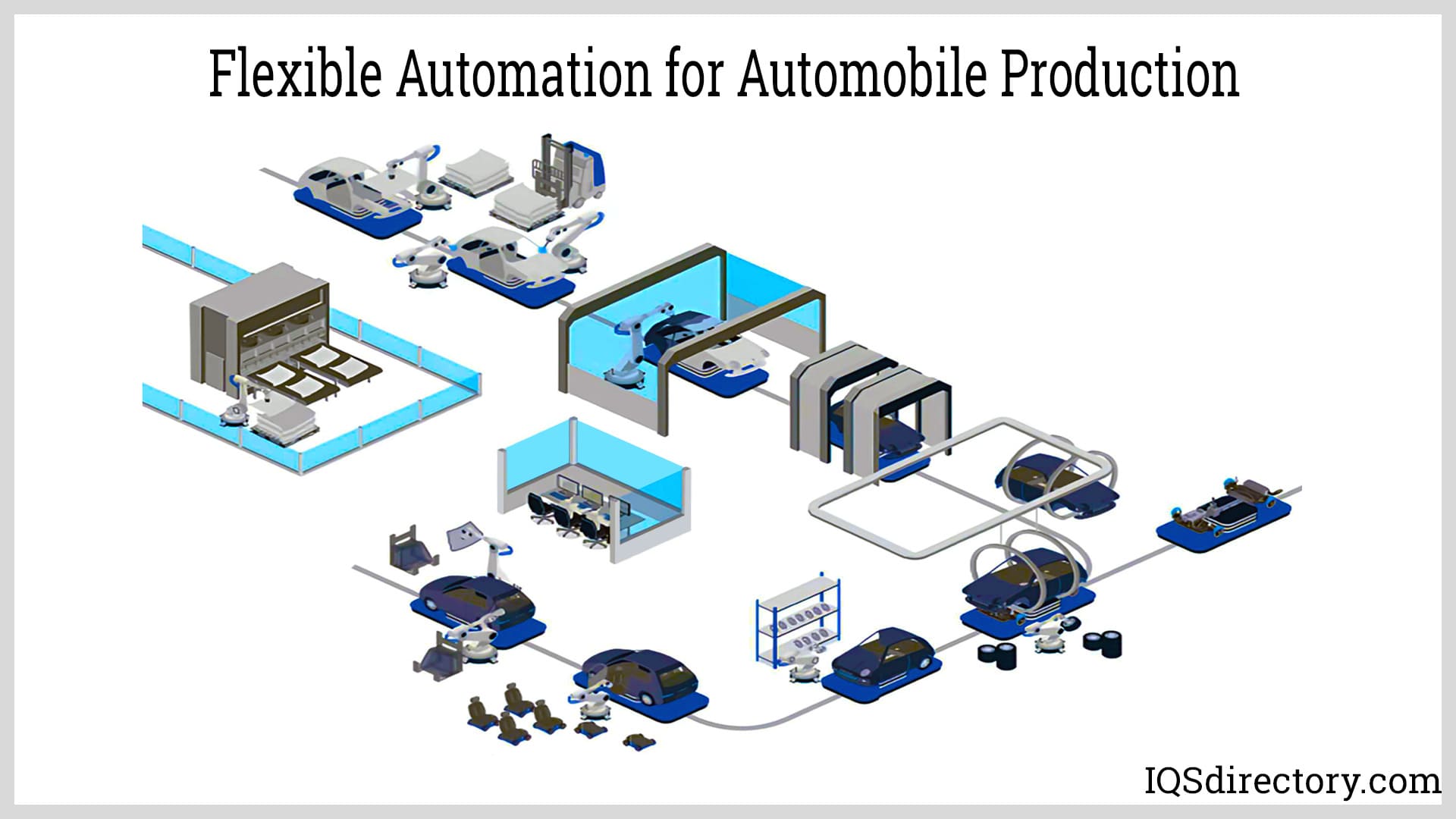 The range of parts, components, and assemblies produced for the auto industry using factory automation include engine blocks, transmissions, seats, dashboards, and bodies. Systems consist of a central controller that links all equipment to the system. Each machine is capable of producing different types of parts by simply changing the programming, removing Ford’s many little factories. Changes can be made quickly by adjusting the parameters of the system.