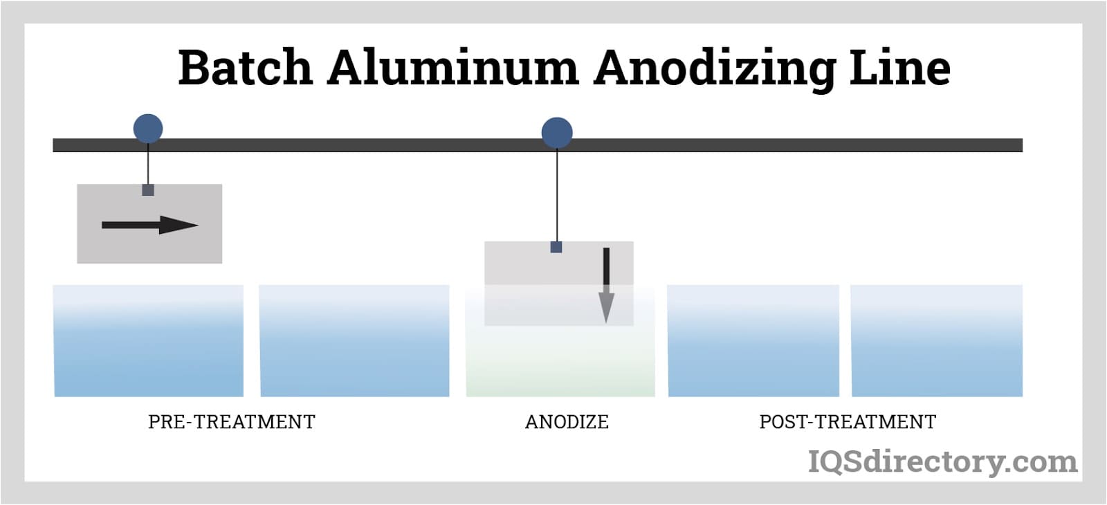 Batch anodizing, the parts are placed in a rack and immersed in a series of baths.