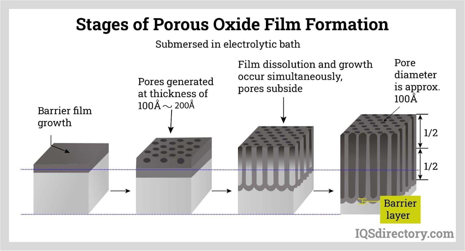 A porous oxide film is formed on the surface when grown in a dilute acidic solution and the thickness is proportional to the electrolysis time and voltage.
