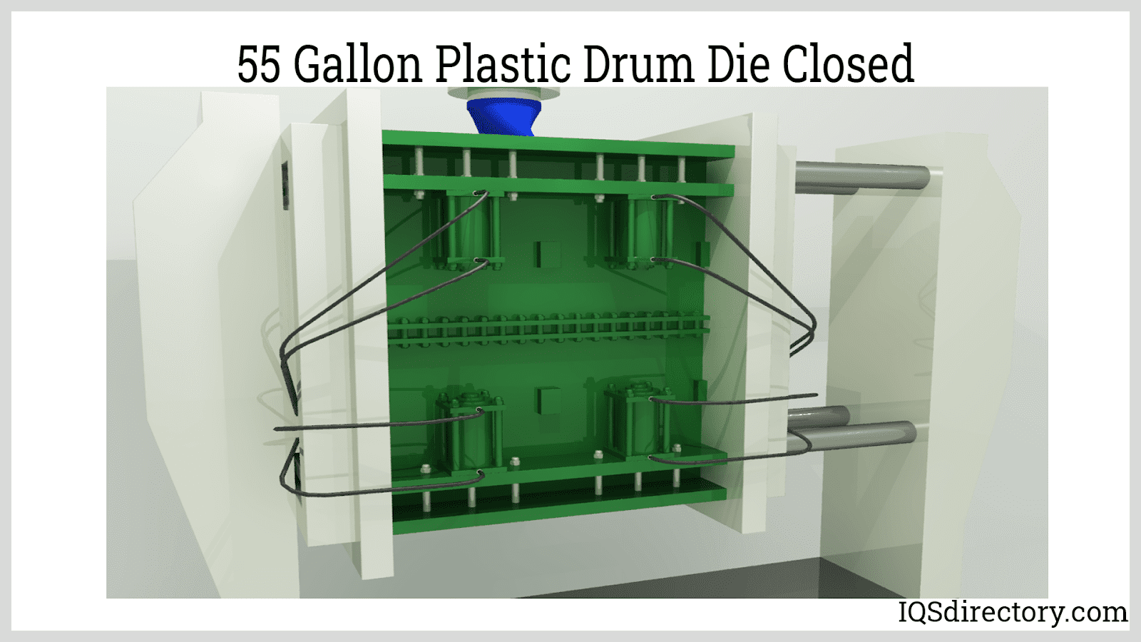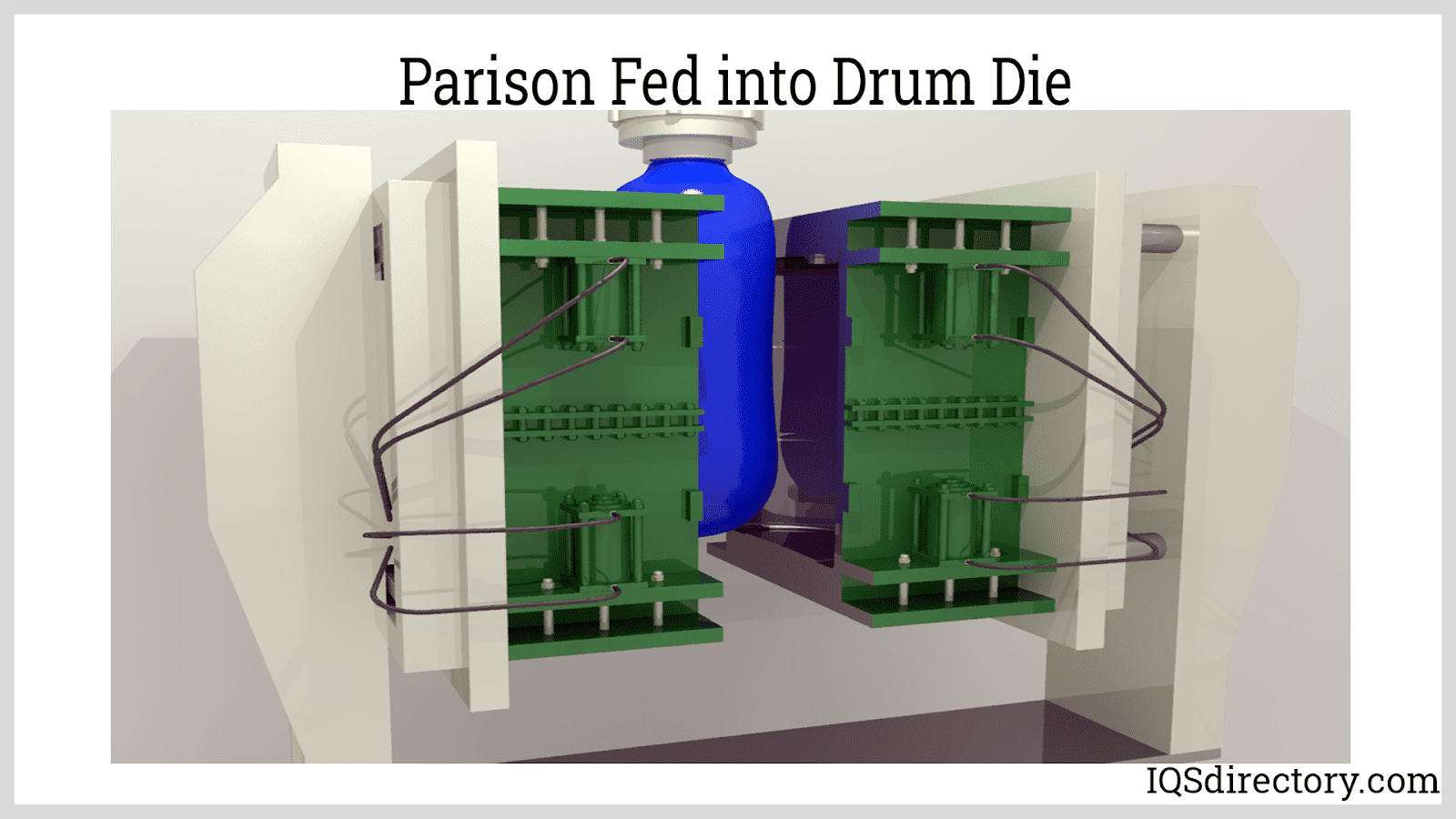 Extrusion Blow Molding: The parison is formed by extruding molten resin vertically, after which the mold halves close and the parison is inflated to form the drum.