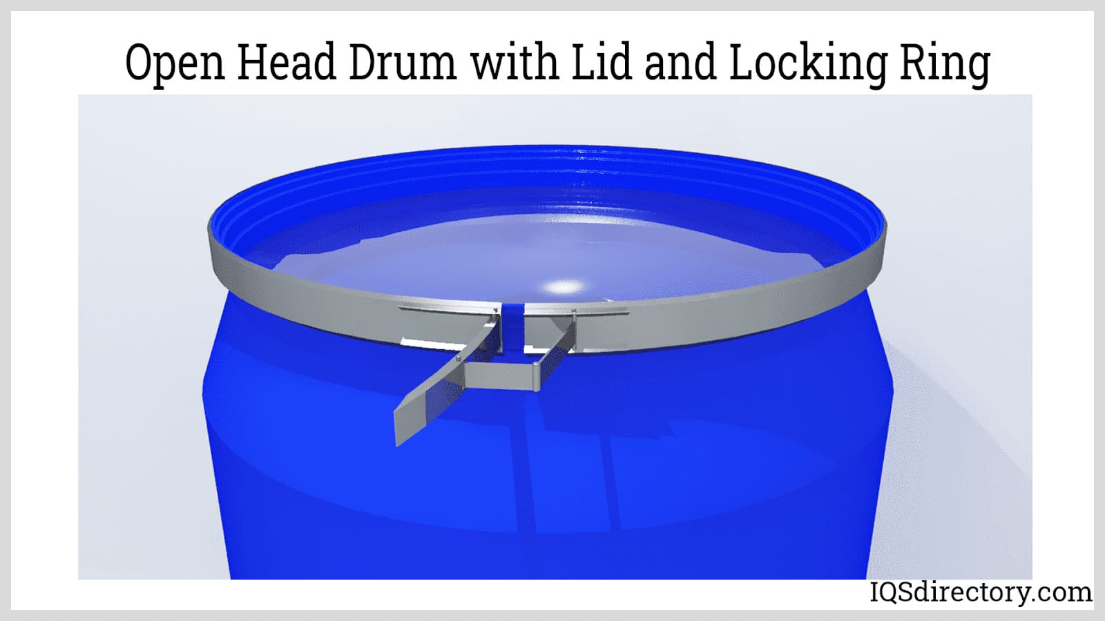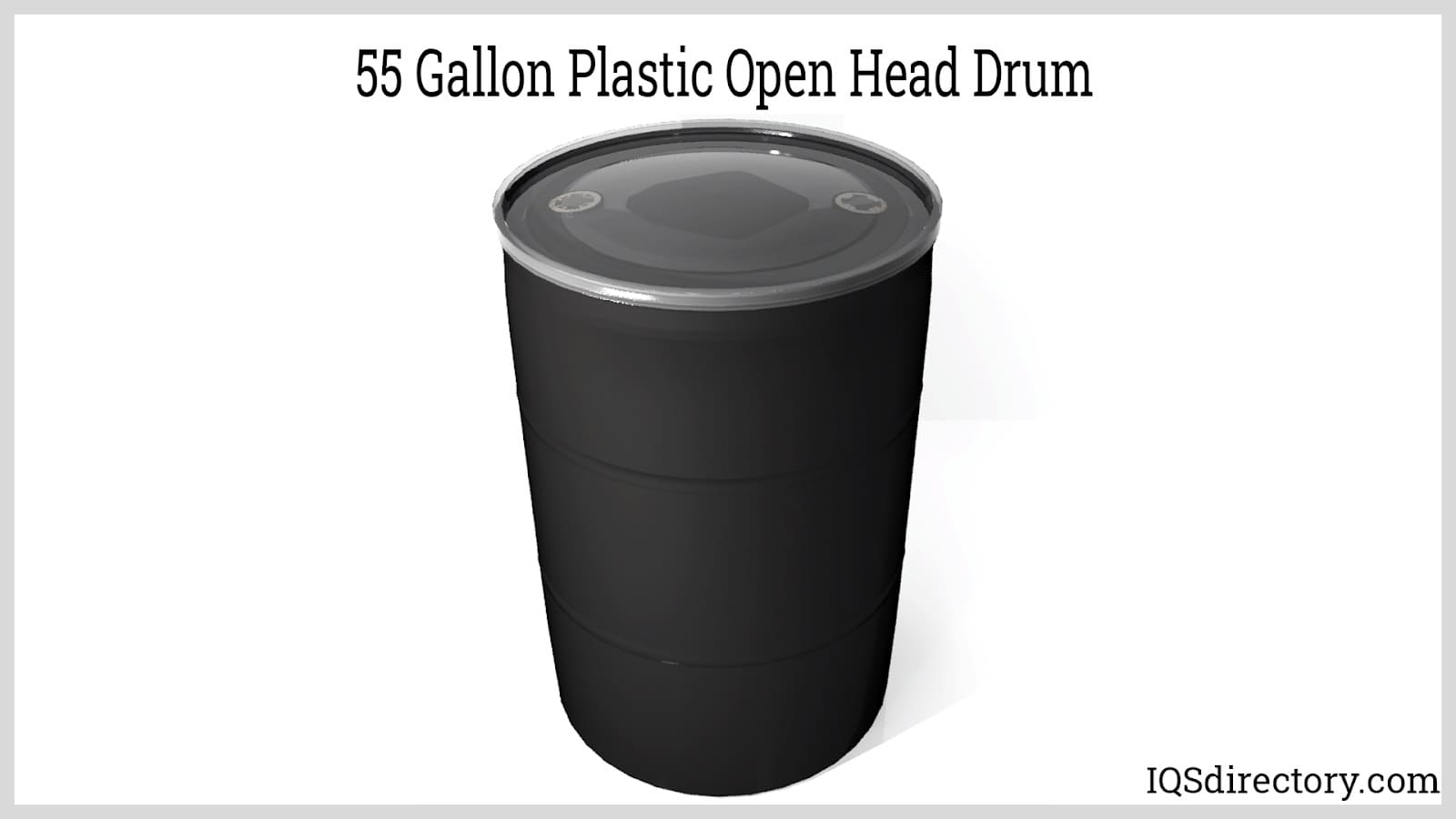 Open-head 55-gallon plastic drums generally have a height of about 35 inches and a top diameter of 23 inches. They feature a removable cover that is secured with either a lever or bolt ring mechanism to ensure a tight seal when not in use. This design facilitates easy and frequent access to the drum's contents, making these drums well-suited for applications that require regular access.