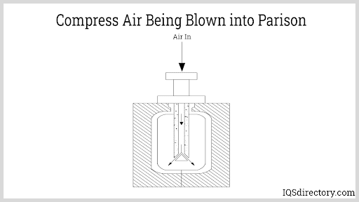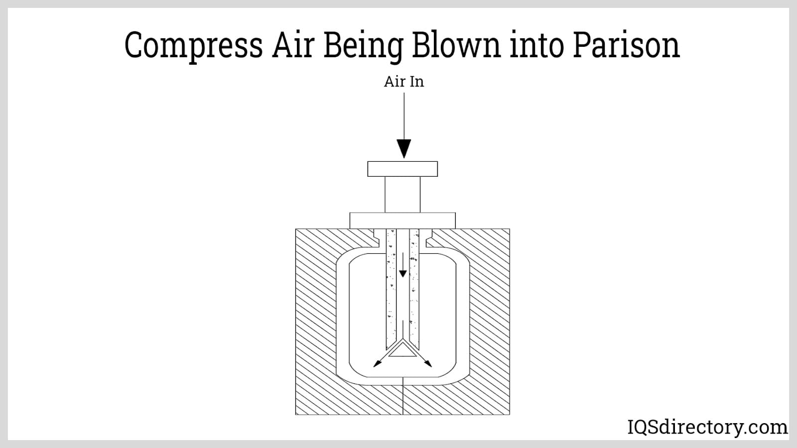 As illustrated below, compressed air is introduced into the parison at controlled high pressure, inflating it against every contour of the mold’s interior surface. This step is crucial for achieving even wall distribution, eliminating weak spots, and ensuring a seamless, defect-free finish. Well-controlled blow molding prevents bubbles, pinholes, or inconsistencies that could otherwise compromise the container's ability to safely store liquids, chemicals, or hazardous waste products.