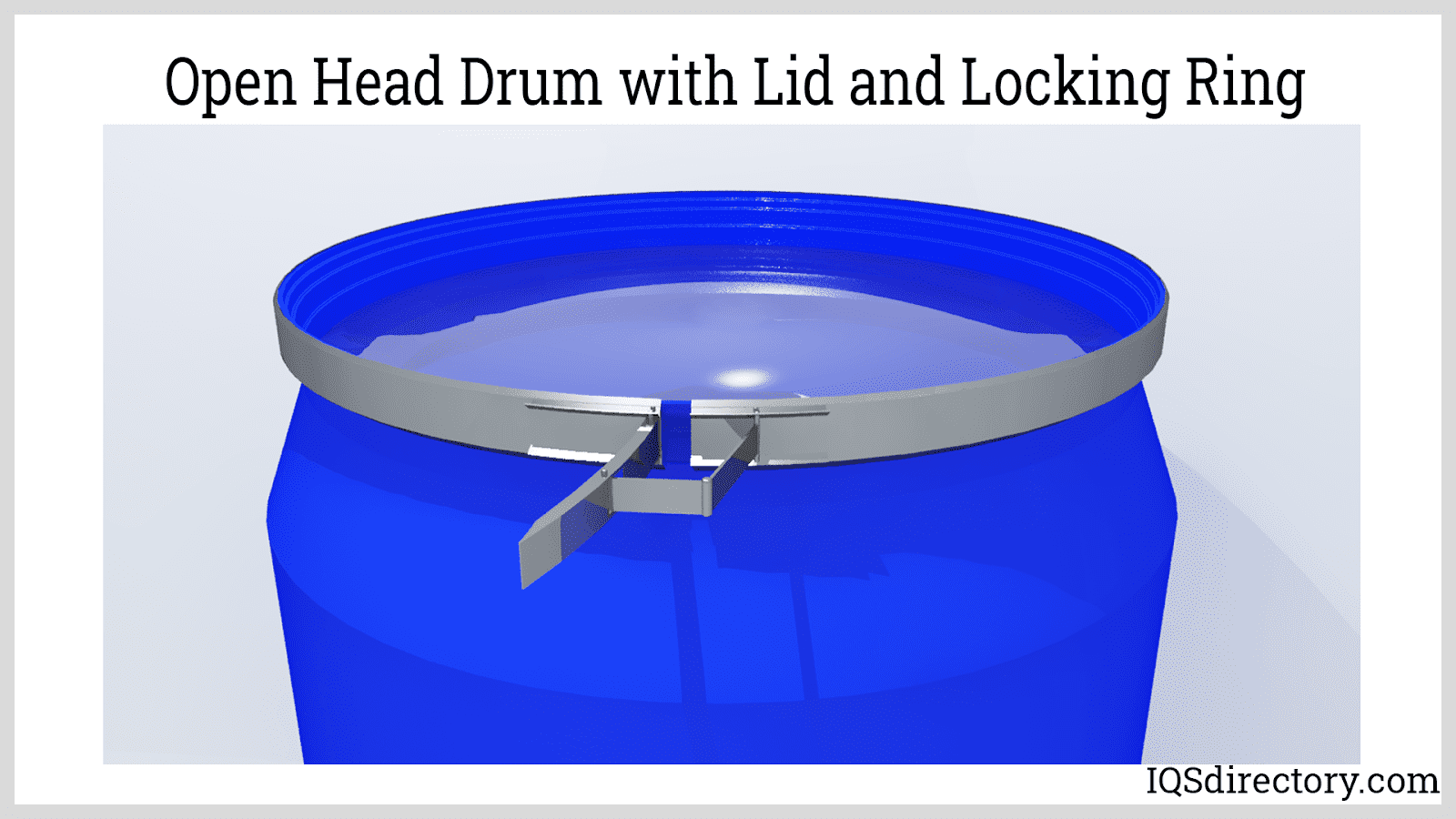 Open-head 55-gallon plastic drums are approximately 35 inches tall with a diameter of 23 inches. These drums feature a removable cover secured by a lever or bolt ring mechanism, ensuring a tight seal when the drum is closed. The lid is designed for easy removal, allowing for straightforward loading and access. Open-head drums are ideal for situations where frequent and unrestricted access to the contents is needed.