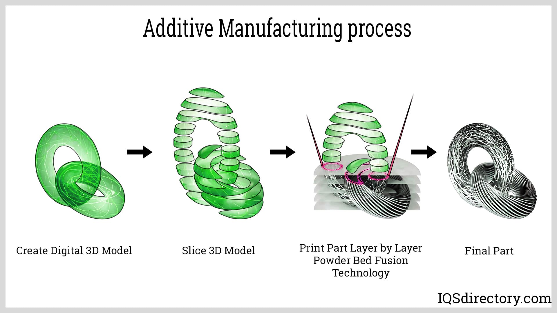 The term additive manufacturing is a brief descriptor of the overall process. Most traditional manufacturing processes involve removing material, casting, molding, or pressure forming sheets of metal. Additive manufacturing adds layers of raw material that vertically build to form a desired shape.