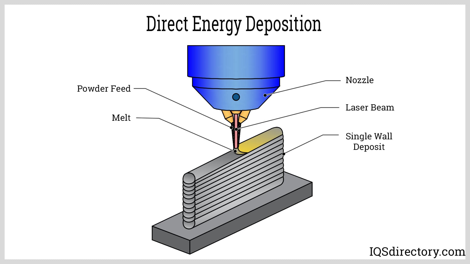 Direct energy deposition involves melting the base material as it is deposited on a specific surface where it solidifies, fusing the applied materials. A nozzle mounted on a multi axis arm allows for variable depositing. A special sealed chamber with limited oxygen is used to complete the process. Electron beam DED systems are performed in a vacuum while laser based DED systems use an inert chamber.