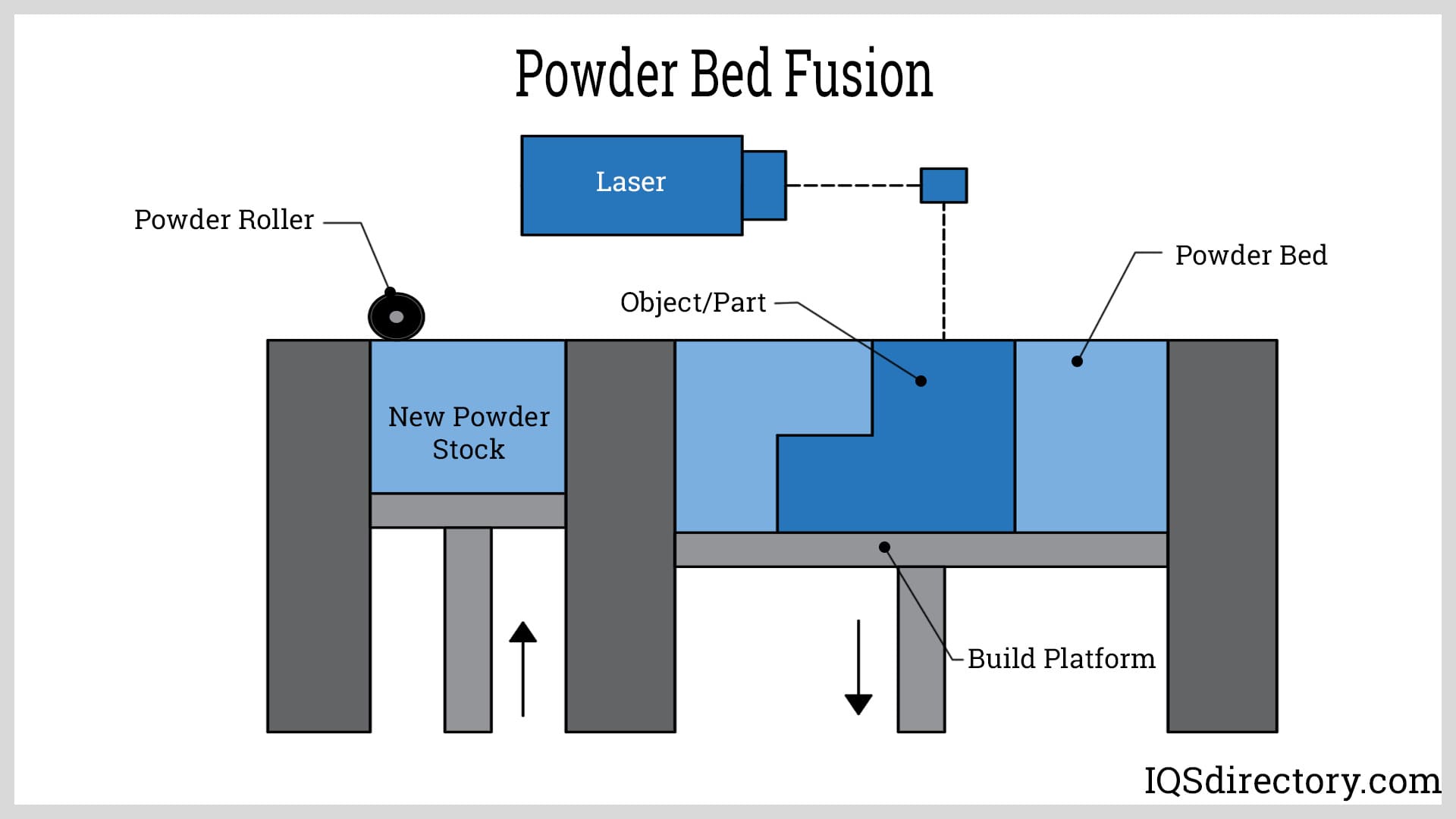 The powder bed fusion process begins by spreading a layer of powder over the bed. The particles are melted to the form of the designed pattern by a laser. Once the first layer is completed, the building platform shifts downward to allow the forming of the next layer. The subsequent layers are bonded until a uniformly shaped part is produced.