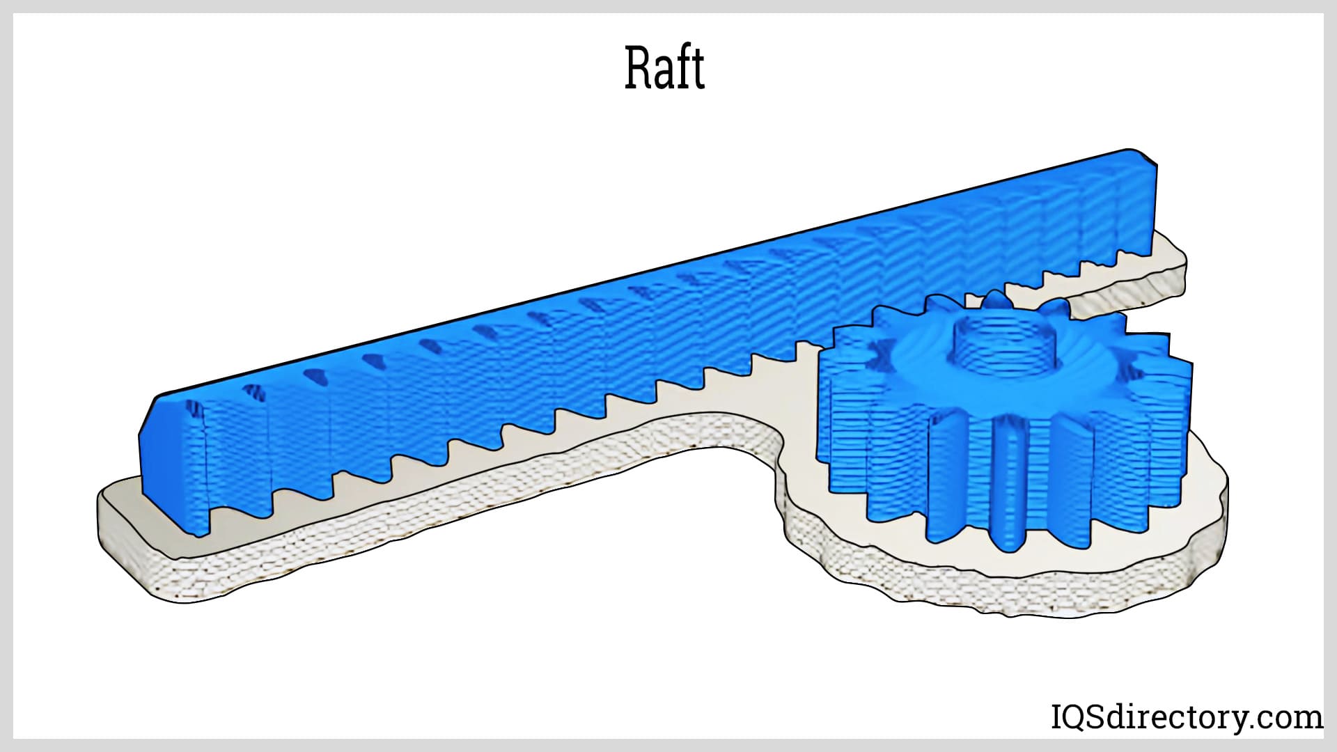 Raft – A raft is a flat piece of material that supports the base. It is wider than the first layer and similar to the brim. Unlike the brim, the raft is placed under a part to provide support.