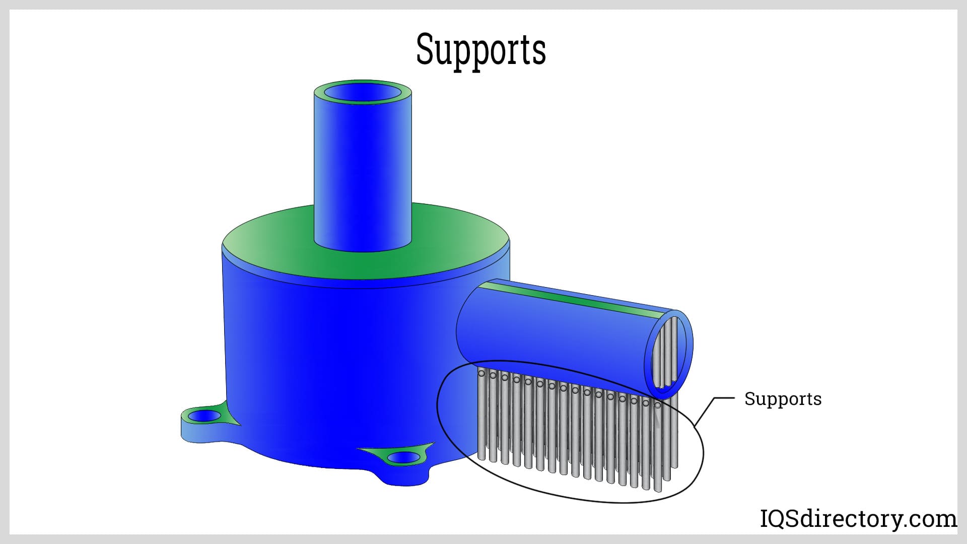 A basic rule for adding supports is the 45-degree principle. If the overhang, from the vertical, is less than 45o, supports will not be needed. When the overhang is greater than 45o from the vertical, supports will be required. A failure to properly use supports can lead to printing failure.