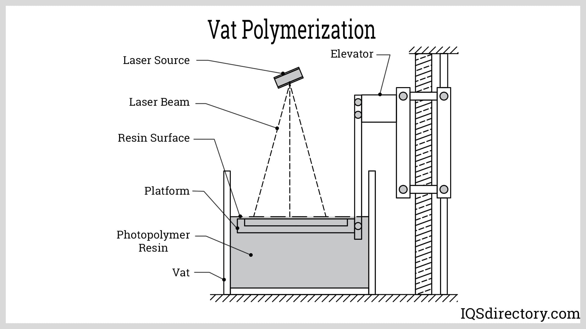 The material for vat polymerization is a photopolymer or light activated resin that changes properties when exposed to light, which causes its molecules to chain link. Stereolithography is a photopolymerization technology, which is one of the three main types of vat polymerization.