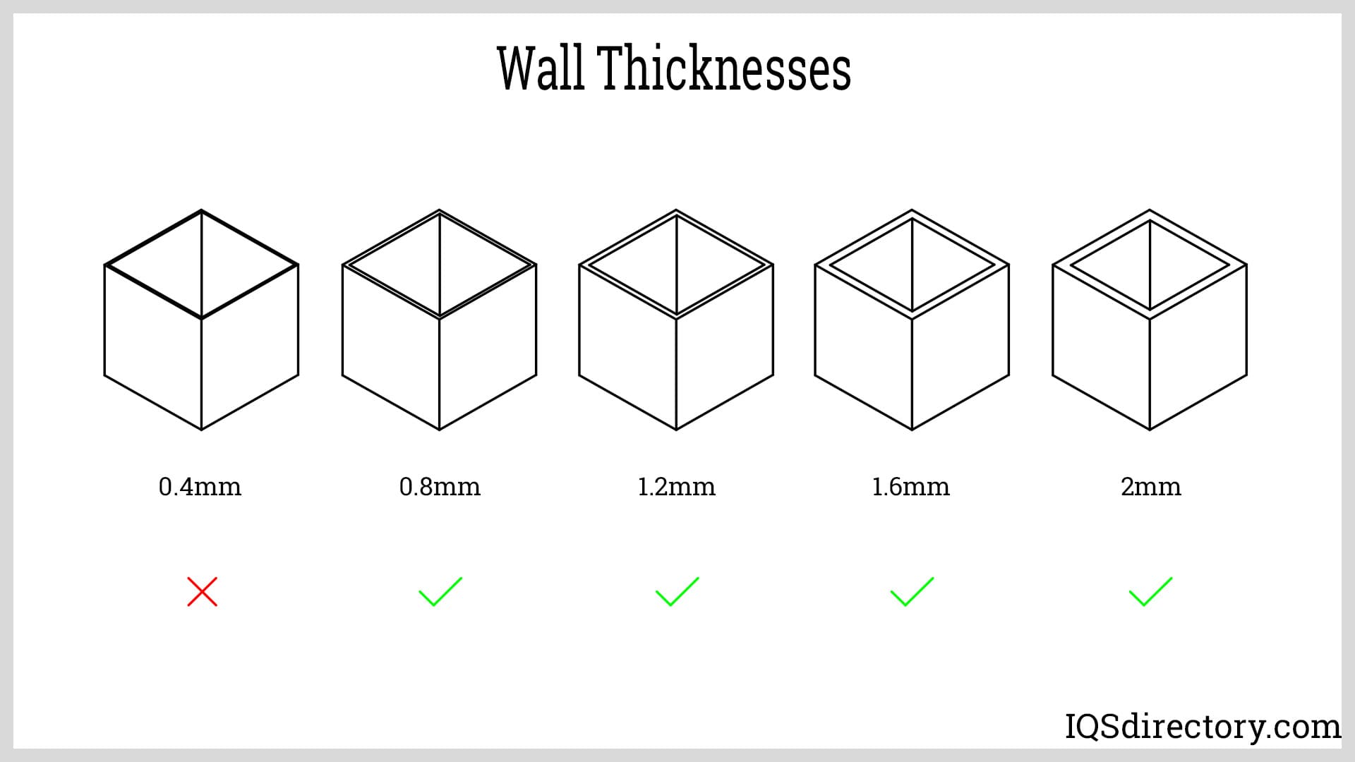 There can be printability issues with walls that are too thin. Equipment may avoid printing such walls or the formation of the walls can produce holes and gaps that weaken the structure of the object being formed. In all cases, thin walls lack strength and are too fragile, which makes them prone to breakage under stress. The general rule for wall thickness is the thickest wall that can be printed without causing overuse of materials and thermal stress.