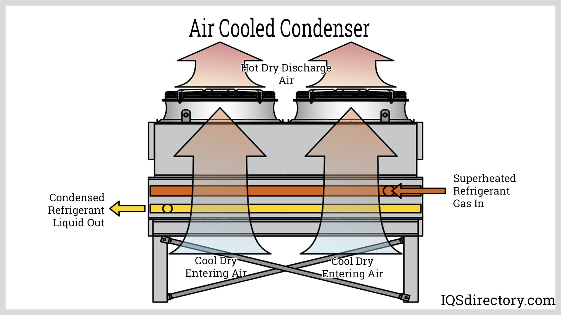 Industrial condensers condense the refrigerant back to a liquid. They transfer the heat from the refrigerant as it is changed to a liquid phase. The type of application for which the condenser is used determines the type of condenser since different applications require the handling of different pressures and levels of temperature. The cooling process for condensers can be air or water depending on the air conditioning system design.