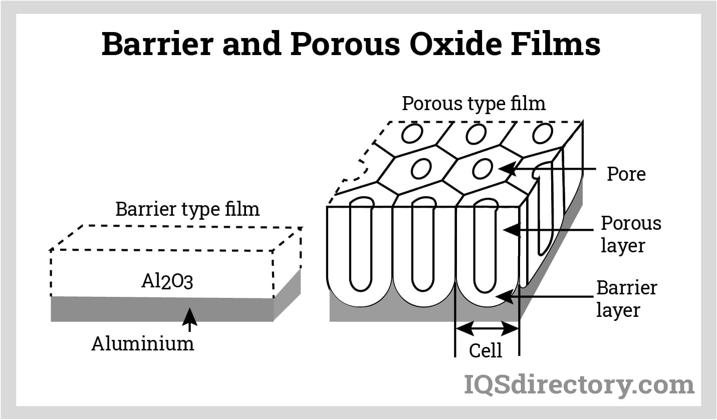 The electrolysis stage may produce a barrier or porous film, depending on the composition of the electrolyte bath. The porous film is more common between the two.