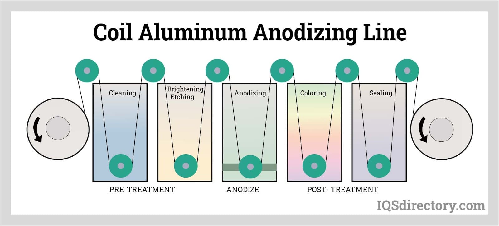An anodizing operation may be a batch or continuous process. The stages of this operation are pre-treatment, electrolysis, coloring, and sealing.