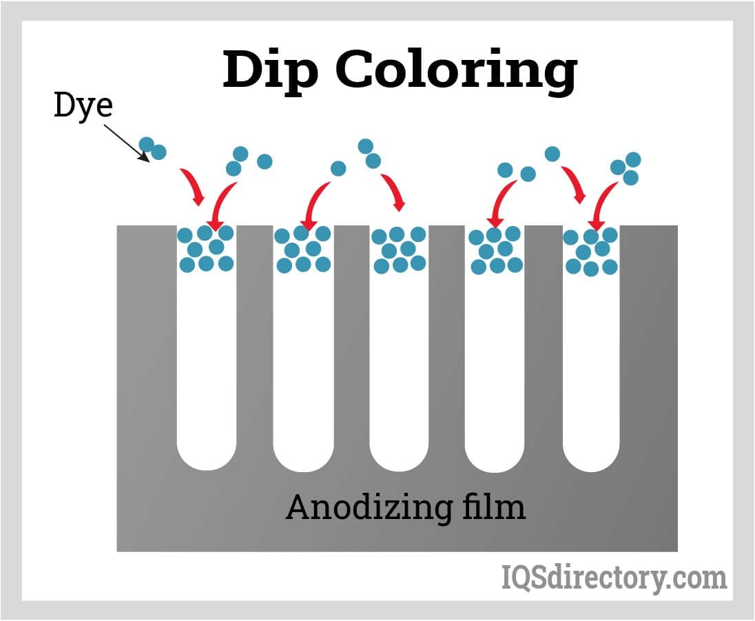 In dip coloring, the anodized component is submerged in a bath containing dye. The dye adheres to the surface of the pores in the oxide film. The final color achieved is influenced by the specific dye used and its chemical properties. This method is cost-effective and enables a variety of colors to be applied to aluminum parts. However, the resulting colored film is less resistant to UV light compared to those produced by other techniques.