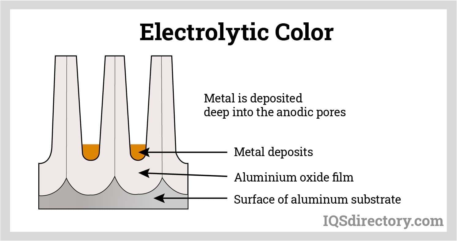 In the electrolytic two-step anodizing process, the component is first anodized through electrolysis and then immersed in a bath with metallic salts. An electric current is subsequently applied, causing metallic ions to be deposited within the pores of the oxide layer. This deposition imparts a unique color to the anodized surface. Common metals used for coloring include cobalt, tin, copper, and nickel. The final color and its quality depend on both the type of metal used and the concentration of metallic deposits within the pores.