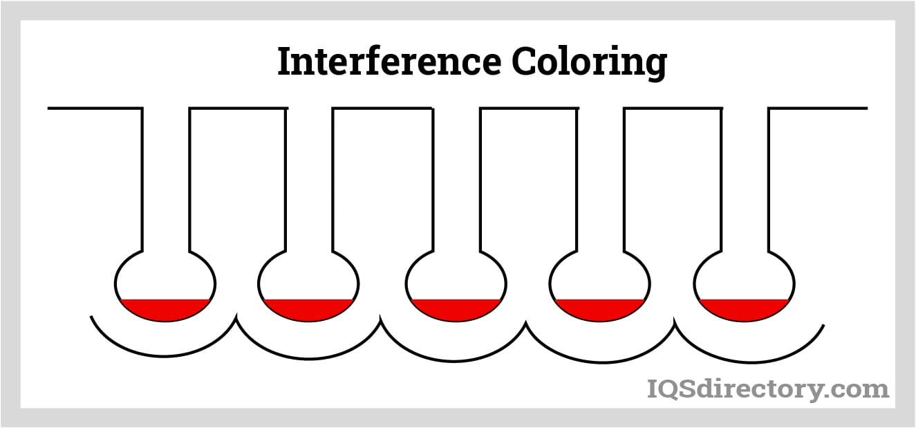 Interference coloring involves expanding the base of the oxide film's pores to allow for a greater deposit of metallic ions through electrolysis. This technique results in light-resistant colors, such as blue, green, yellow, and red, which are produced through the optical interference of visible light waves.