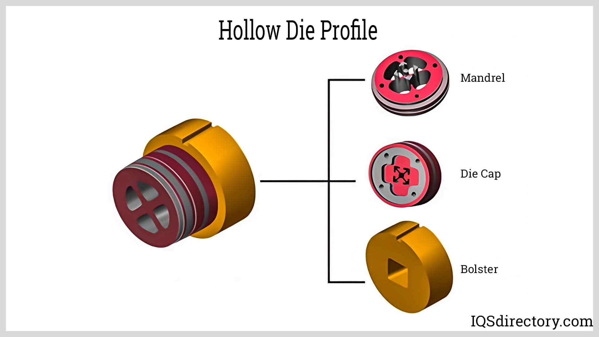 Hollow dies are used to produce extrusions with voids and openings, such as tubing or intricate profiles. They feature a mandrel with two or more portholes to form the internal features of the profile. As the billet is extruded, it separates at each port and then rejoins later in the process. The die cap shapes the profile and is supported by the bolster, which also provides support for the mandrel.