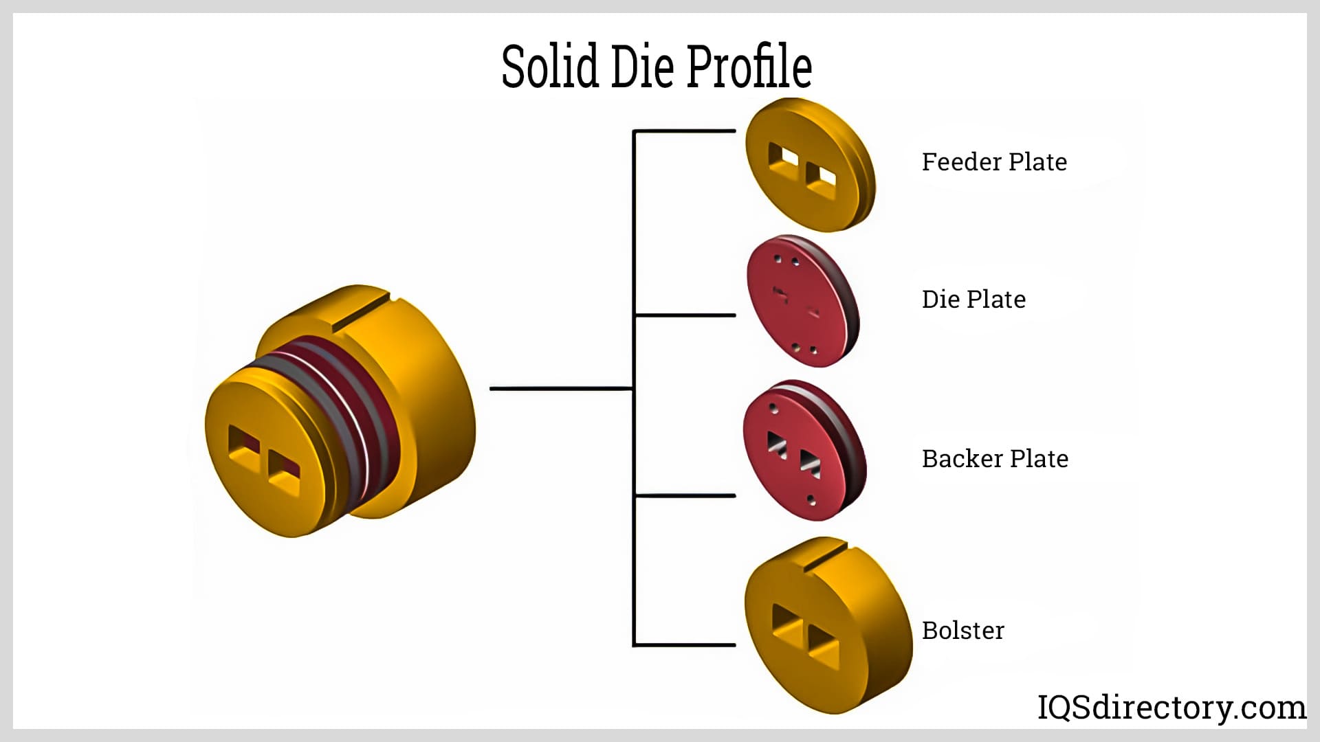 Solid dies or profiles produce shapes without voids or openings, such as beams, angles, and rods. They are generally the least expensive and easiest to manufacture. A solid die comprises a stack that includes a feeder plate, die plate, backer plate, and bolster. Among these, the die plate defines the shape or profile of the extrusion.