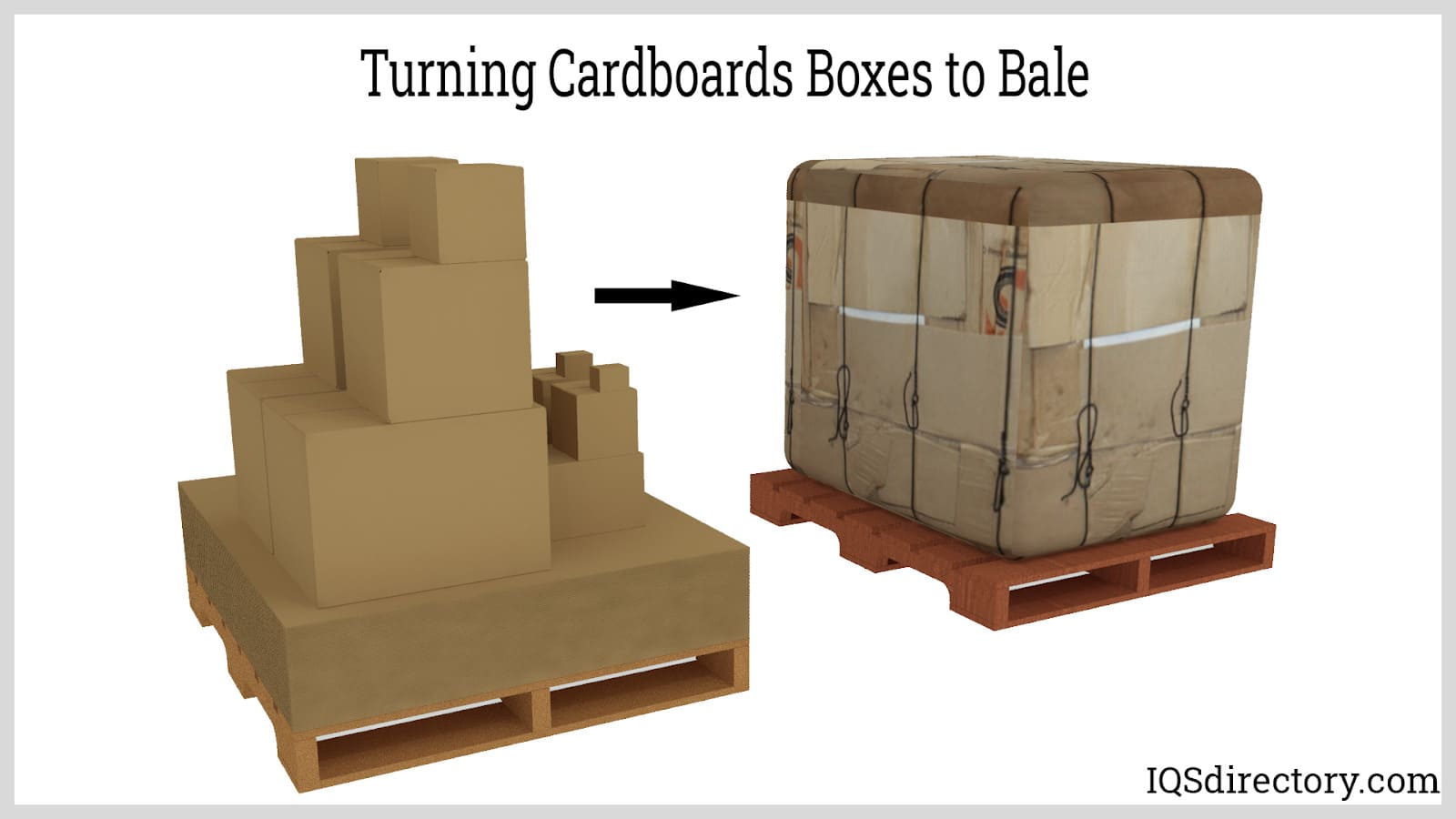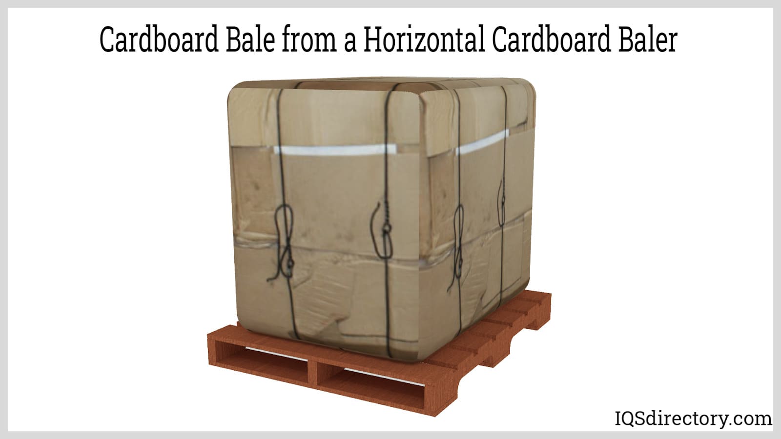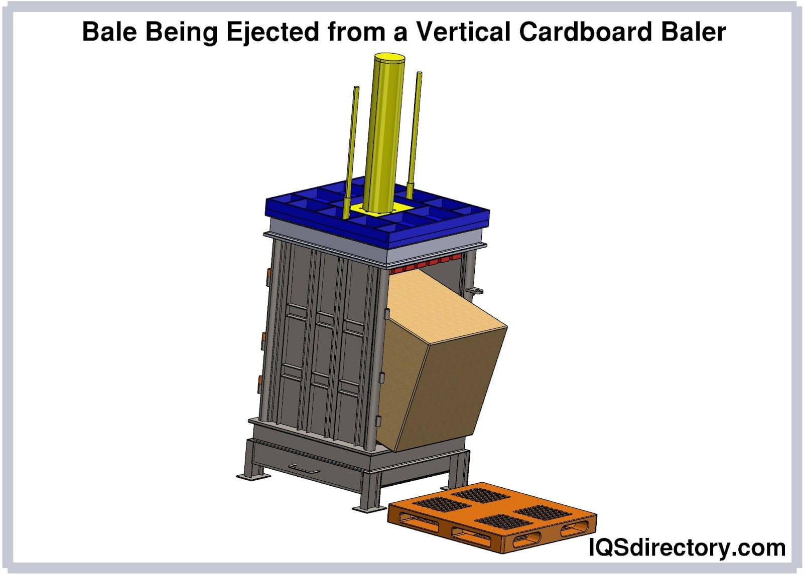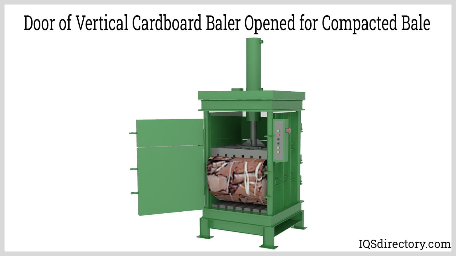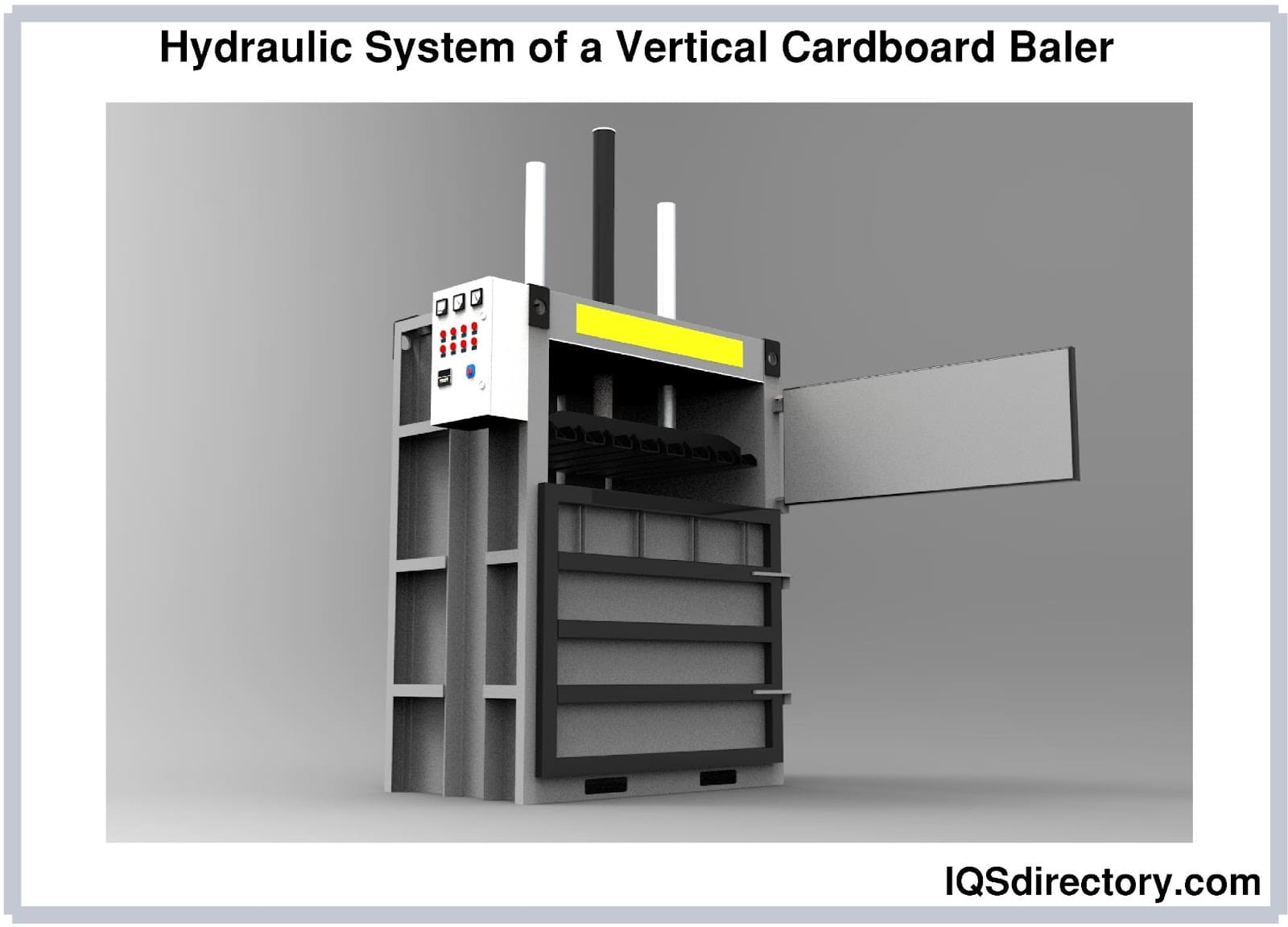 A cardboard baler is a mechanism that uses a metal plate driven by a hydraulic ram to apply tremendous pressure and force to crush, compact, and compress pieces of cardboard into tightly formed and easy-to-transport cubes and rectangular bales.