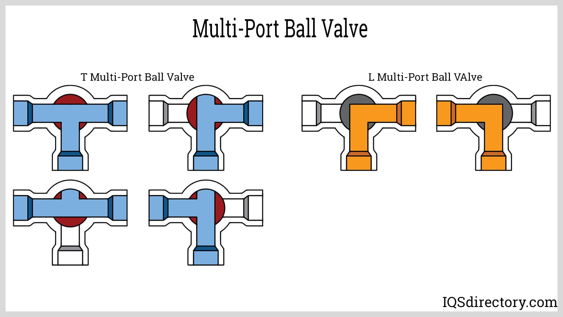 Multi-port ball valves are designed to manage multiple fluid streams, allowing for diversion, combination, splitting, or shutting off of flows. They achieve this through a ball with either an L-shaped or T-shaped bore. While these valves can direct flow from a single inlet to multiple outlets, they do not regulate the flow rates to each outlet stream. Multi-port ball valves are versatile in combining several streams into one or redirecting flow as needed. The schematic diagram below illustrates the various flow configurations for L-shaped and T-shaped multi-port ball valves.
