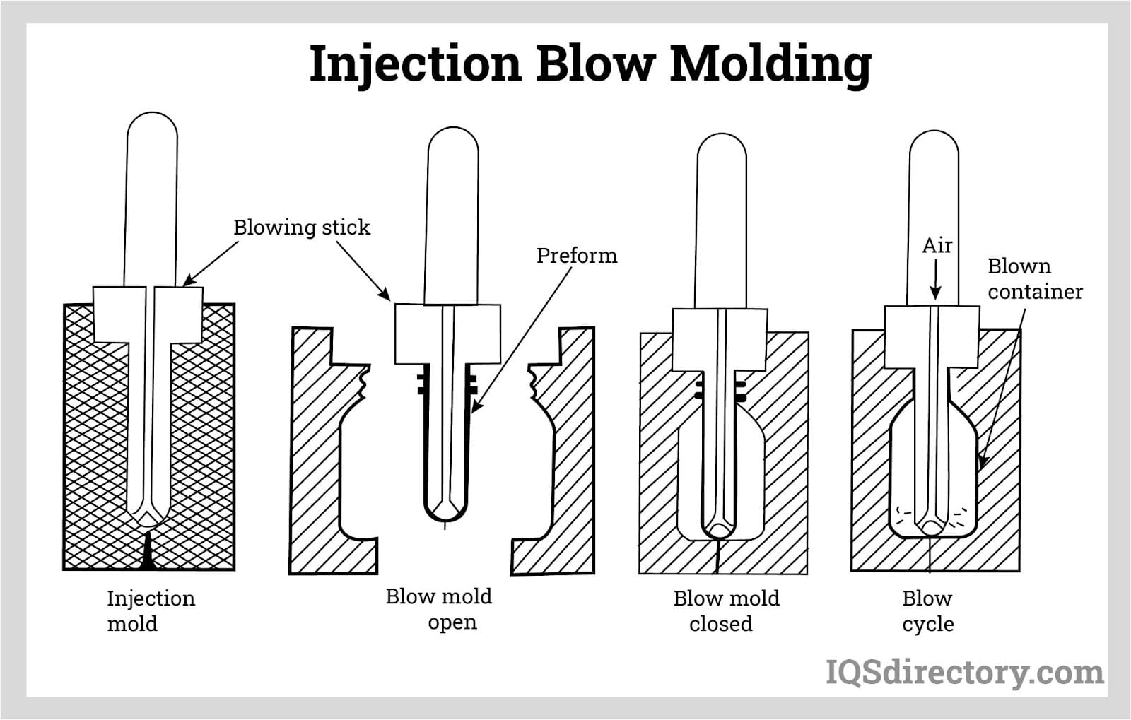 Injection blow molding (IBM) is pivotal for producing hollow plastic items through a three-stage procedure. Initially, molten plastic fills a mold cavity to create a preform with a test tube-like shape and a molded screw finish at the top. This preform enters the blow molding stage where air is blown through a core pin to expand it against a cool mold, followed by its ejection at the final stage.
