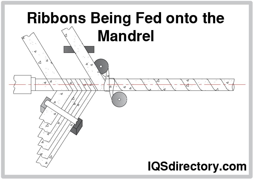 Prior to the paper ribbons being wrapped around and fed by the winder onto the mandrel, they pass through an adhesive bath, which is a cascading gluing system that pumps glue onto each ply or layer of paper. As the access glue accumulates, it is wiped off and sent back into the system.