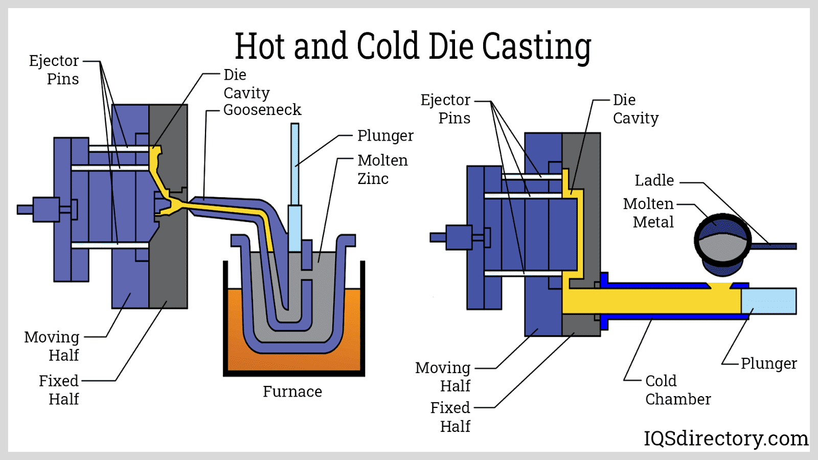 Understanding the difference between these processes helps manufacturers and engineers select the optimal aluminum casting technique for their projects, balancing factors like cost, speed, precision, and material requirements. In the diagram below, hot chamber die casting is shown on the left, and cold chamber die casting is depicted on the right.