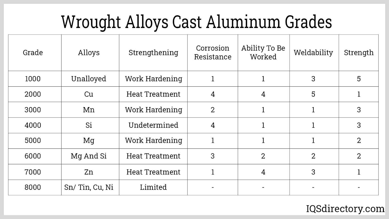The following descriptions pertain to wrought aluminum alloys, which use a different grading system than casting alloys. Unlike casting alloys, wrought alloys do not include a decimal in their designation, which helps distinguish between the two grading methods.
