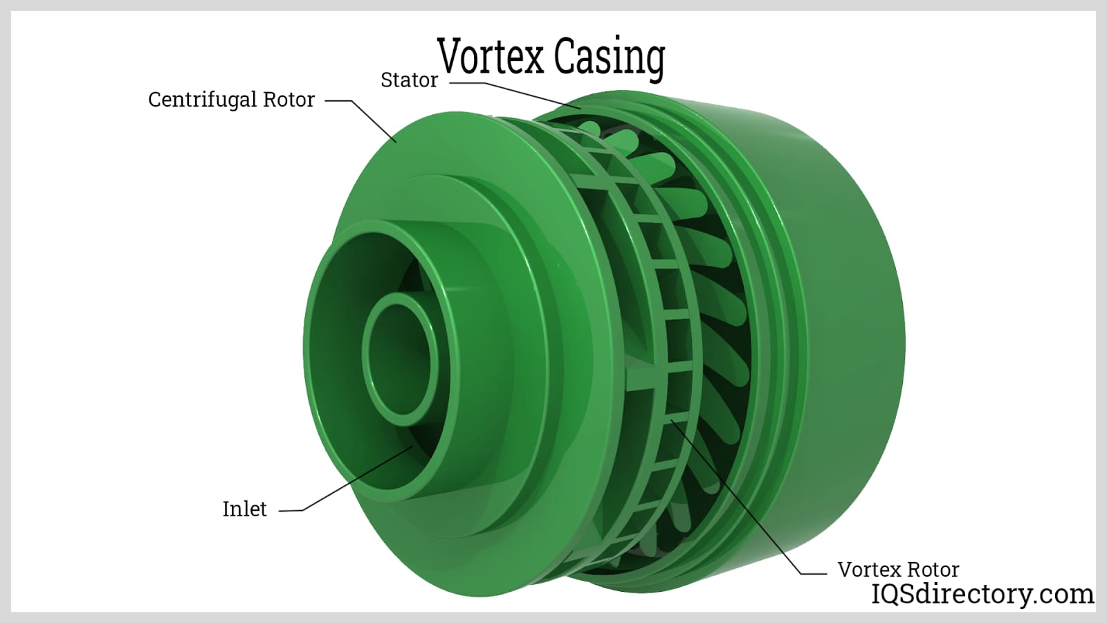 This casing includes a circular chamber between the impeller and the volute casing. After leaving the impeller, the fluid enters the vortex chamber before advancing to the volute casing. This configuration effectively converts velocity energy into pressure and typically offers performance advantages over the volute casing.
