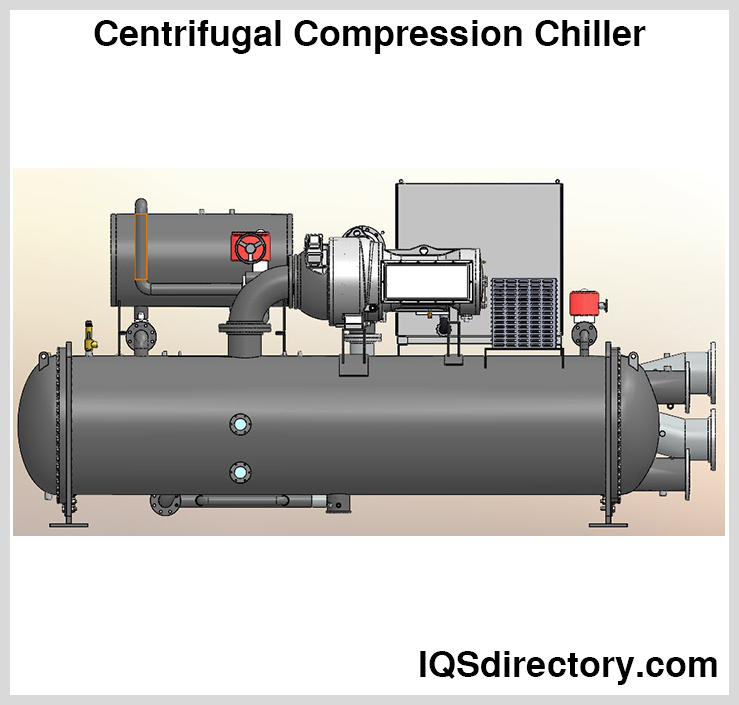 The compressor drives the refrigerant flow within the chiller. Compressor types include screw, reciprocating, scroll, rotary, and centrifugal. Centrifugal compressors are particularly dynamic, operating differently by using an impeller to accelerate and then slowly reduce the speed of the gas to compress it, contrasting with positive displacement compressors that condense gas using mechanisms such as screws, pistons, or rotors to elevate vapor pressure.