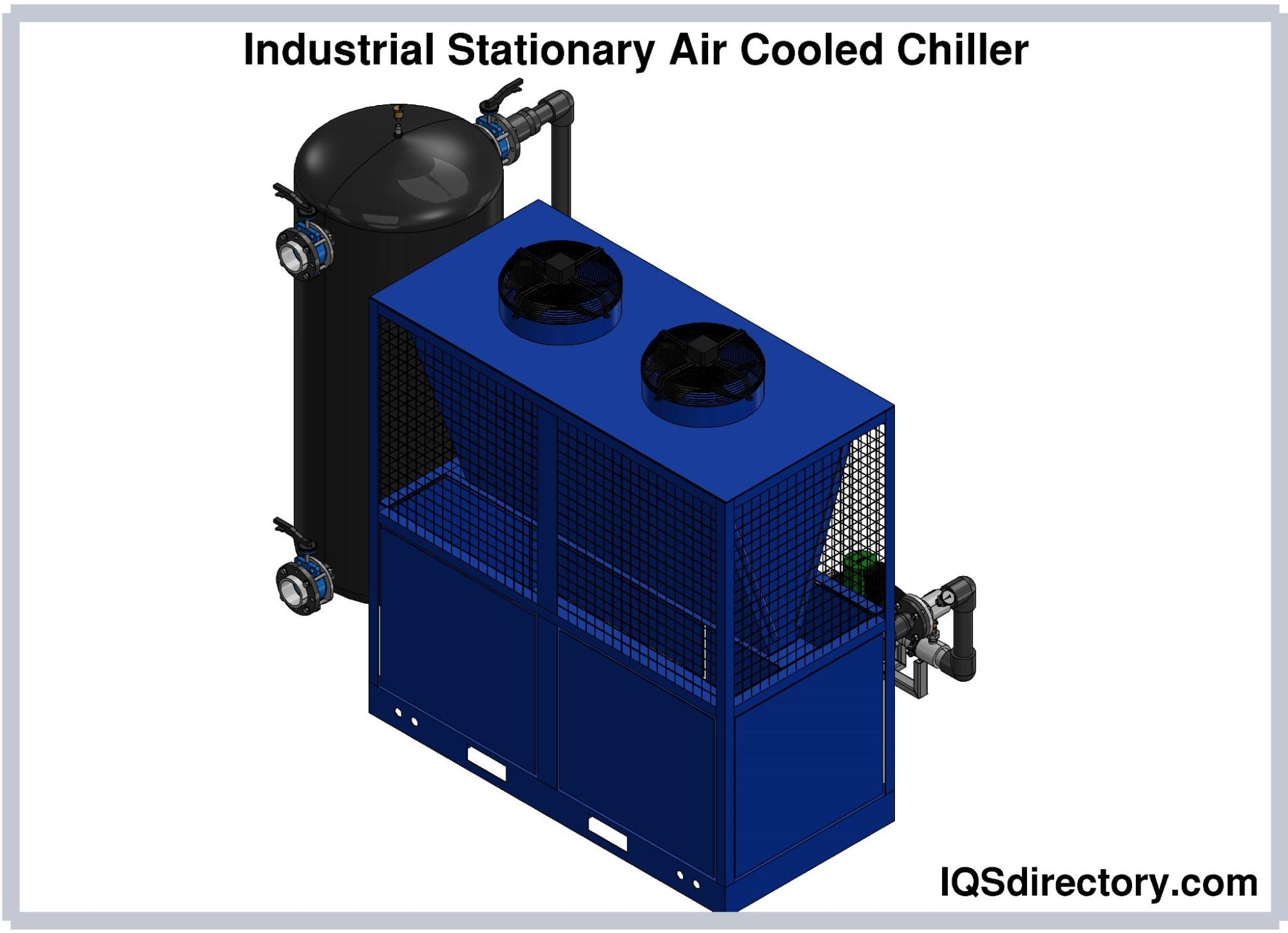Industrial stationary air cooled chillers, also called modular chiller systems, are designed for permanent installation and large commercial or industrial environments. A "stationary air cooled industrial chiller" typically does not include an integrated pump or water tank. Instead, these chillers operate as central cooling modules, connected to external pumps and reservoirs via engineered piping networks.
