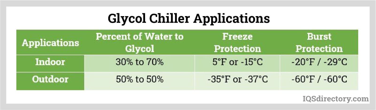 Propylene or ethylene glycol acts as an anti-freeze, preventing freezing inside the coils. The glycol and water mixture also helps protect the chiller from the buildup of algae and bacteria.