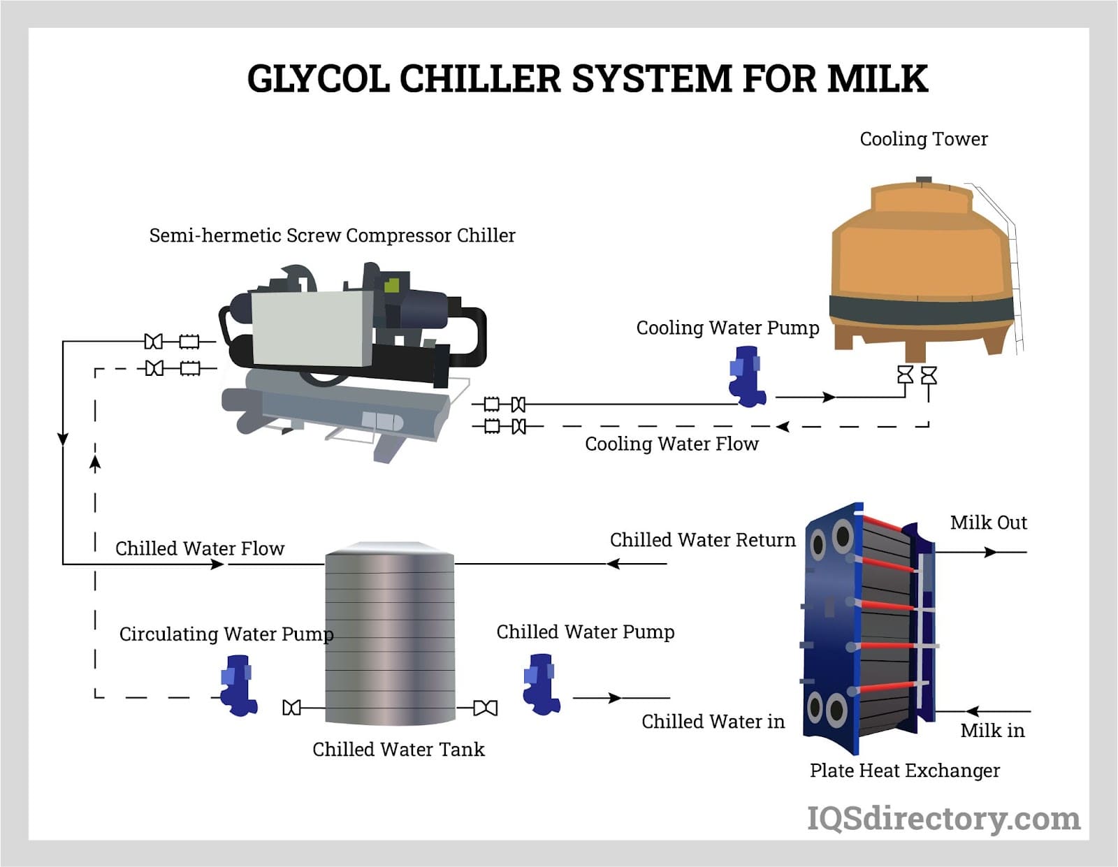 Glycol chillers maintain product integrity by ensuring precise and consistent low temperatures. They are key to rapid and uniform cooling in breweries, dairies, and food processing facilities, preserving product quality and meeting safety standards.