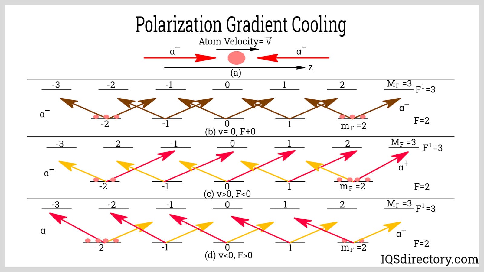 Developed to explain cooling below Doppler limitations, polarization gradient cooling achieves microkelvin to sub-microkelvin temperatures. It generates spatially varying gradients through superposed orthogonal polarization light beams, creating varying polarization states.