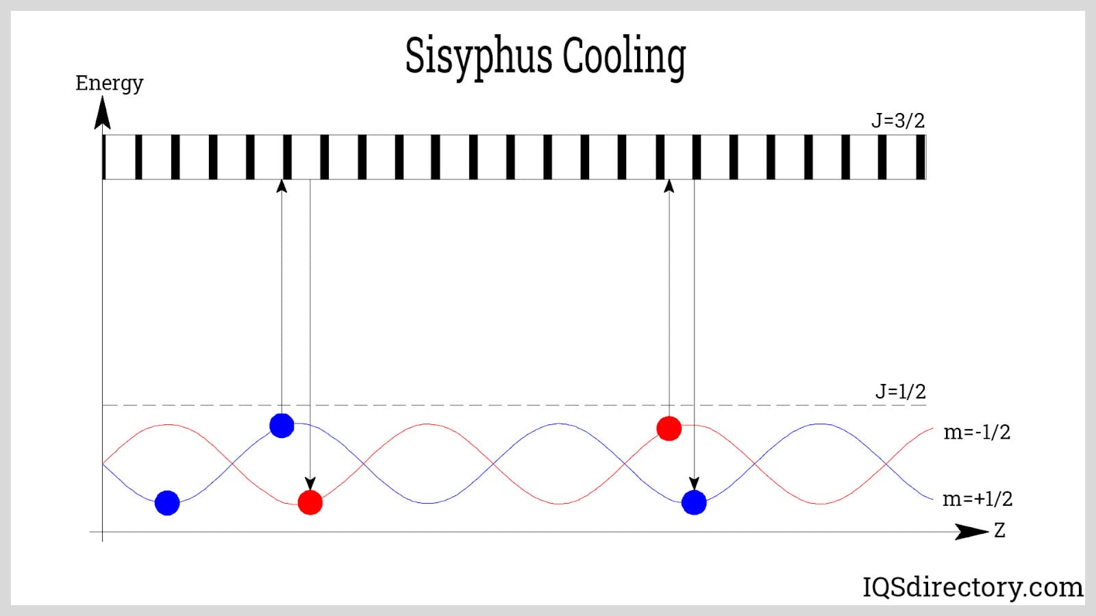 Sisyphus cooling achieves temperatures beneath the Doppler cooling limit by employing two counter-propagating laser beams with orthogonal polarizations. When atoms navigate the potential landscape generated by these standing wave lasers, they lose kinetic energy. Optical pumping transitions them to lower energy states, reducing total atomic energy.
