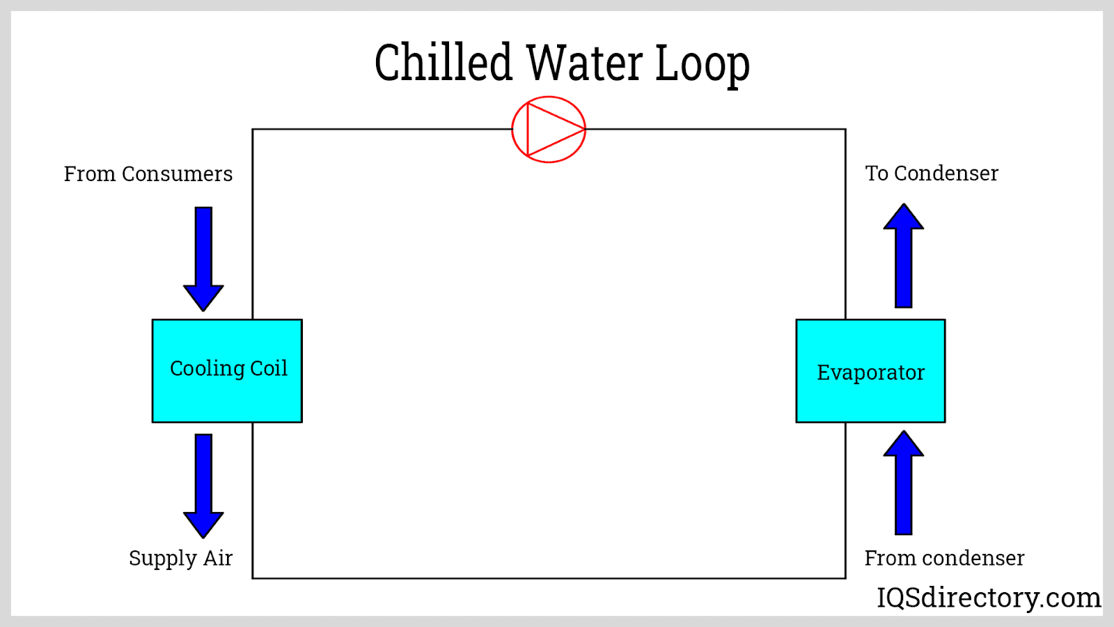 The chilled water loop distributes cooled water or antifreeze to air handlers or process equipment, removes heat, and returns the warmed fluid to the evaporator. This arrangement enables centralized, energy-efficient cooling for large facilities.
