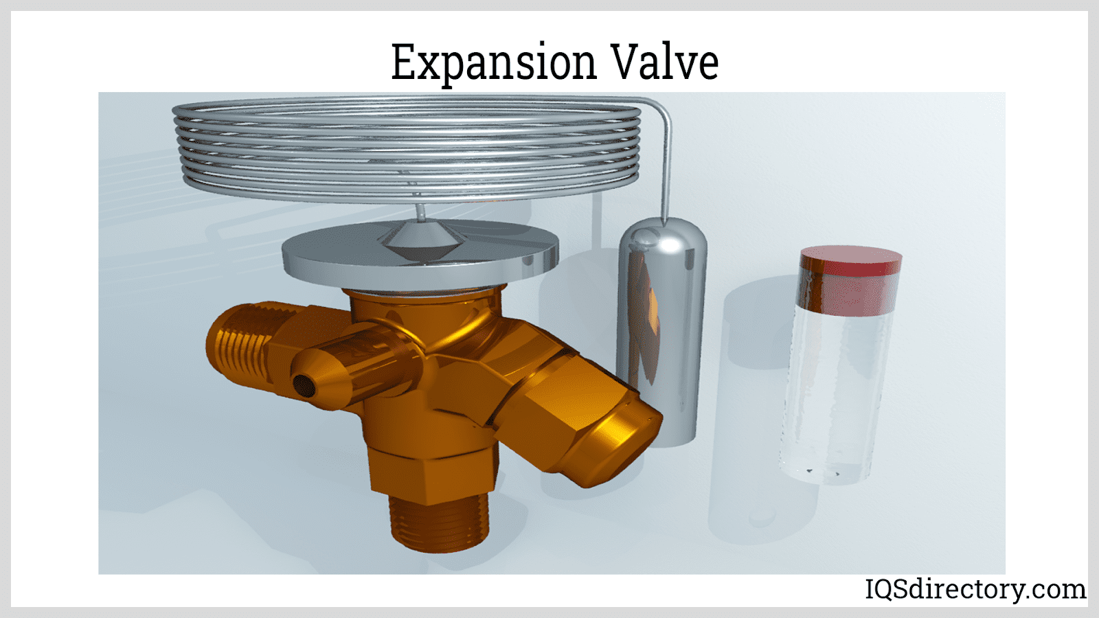 Expansion Valve - The liquid refrigerant moves from the condenser to expansion valves where the pressure of the refrigerant is reduced before being sprayed into the evaporator. The pressure drop cools the refrigerant. When the capacity of the evaporator increases, the expansion valve releases more refrigerant into the evaporator. As the capacity decreases, the expansion valve releases less refrigerant. Additionally, the expansion valve maintains the pressure difference between the condenser, which is at high pressure, and the evaporator that is at low pressure.