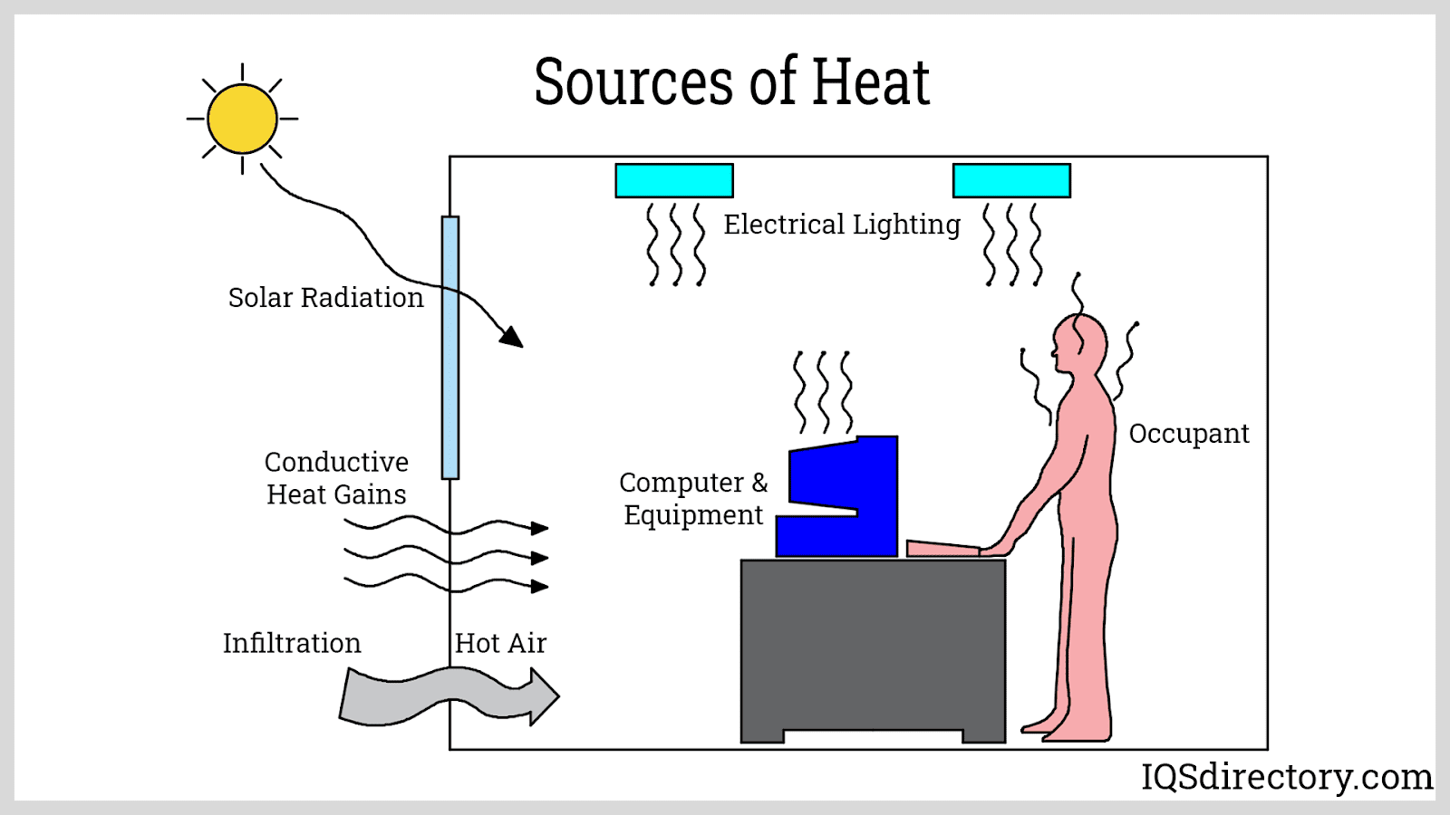 In air-conditioning and ventilation applications, the cooling load is affected by various factors, including solar radiation, heat transfer through the building envelope, infiltration of outdoor air, and internal heat generated by occupants, equipment, lighting, and other sources. Several methods can be used to calculate the cooling load, such as the transfer function method (TFM), cooling load temperature differential (CLTD), heat balance method, and time-averaging (TA) method. These methods are detailed in ASHRAE Handbooks and standards from international organizations like ISO and EN.