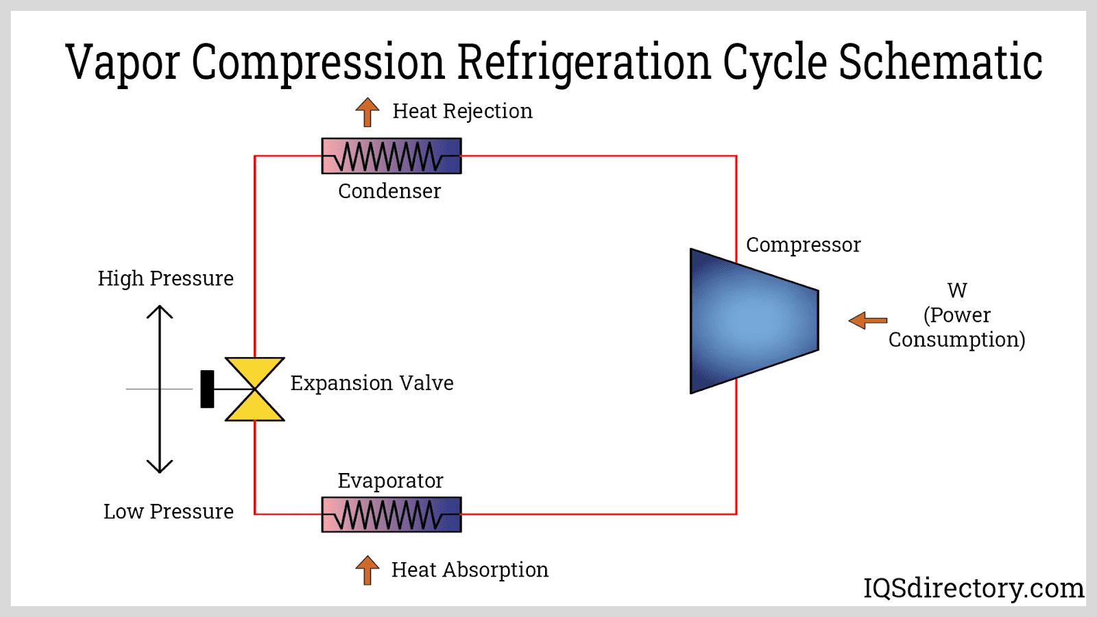 The vapor compression cycle uses refrigerant that alternates between liquid and vapor states, cycling through compression, condensation, expansion, and evaporation. This cycle efficiently transfers heat, enabling precise cooling for various applications.
