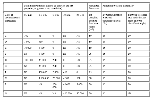 Class FED STD 209E Equivalent Maximum Concentration limits for particles equal to and larger than the sizes listed below