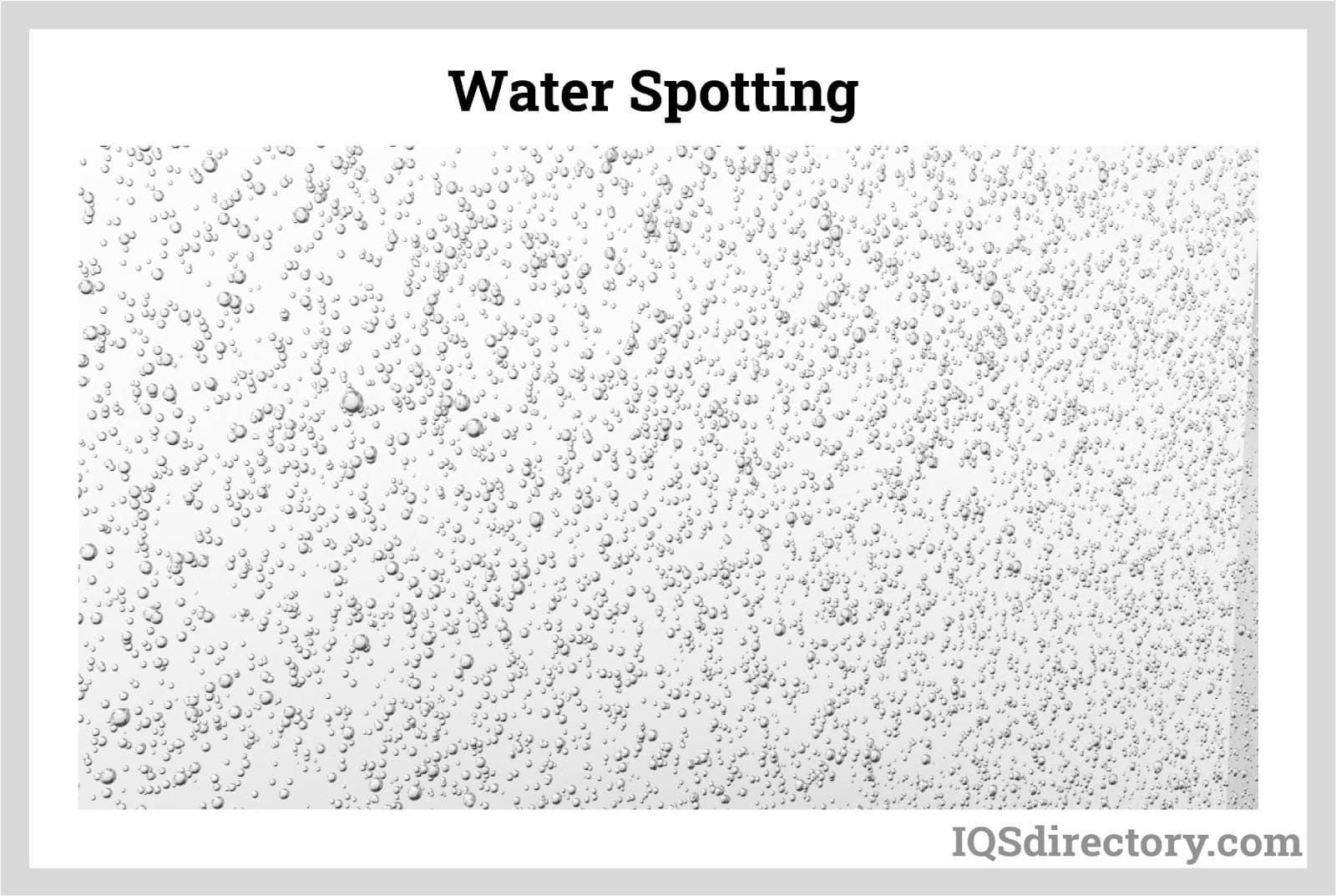 To prevent water spotting—common in high-purity manufacturing and finishing—using deionized water for the final rinse is an effective solution. Water spots typically occur due to minerals present in regular tap water, which can be eliminated by using water free of these minerals. Another approach to minimizing water spots is to use an air blow-off technique to expel water droplets before they have a chance to dry. The success of this method depends on the orientation and arrangement of the parts on the racks. If the air stream cannot reach certain areas due to the parts' geometry or because parts are obstructing each other, spotting may still occur in those locations.