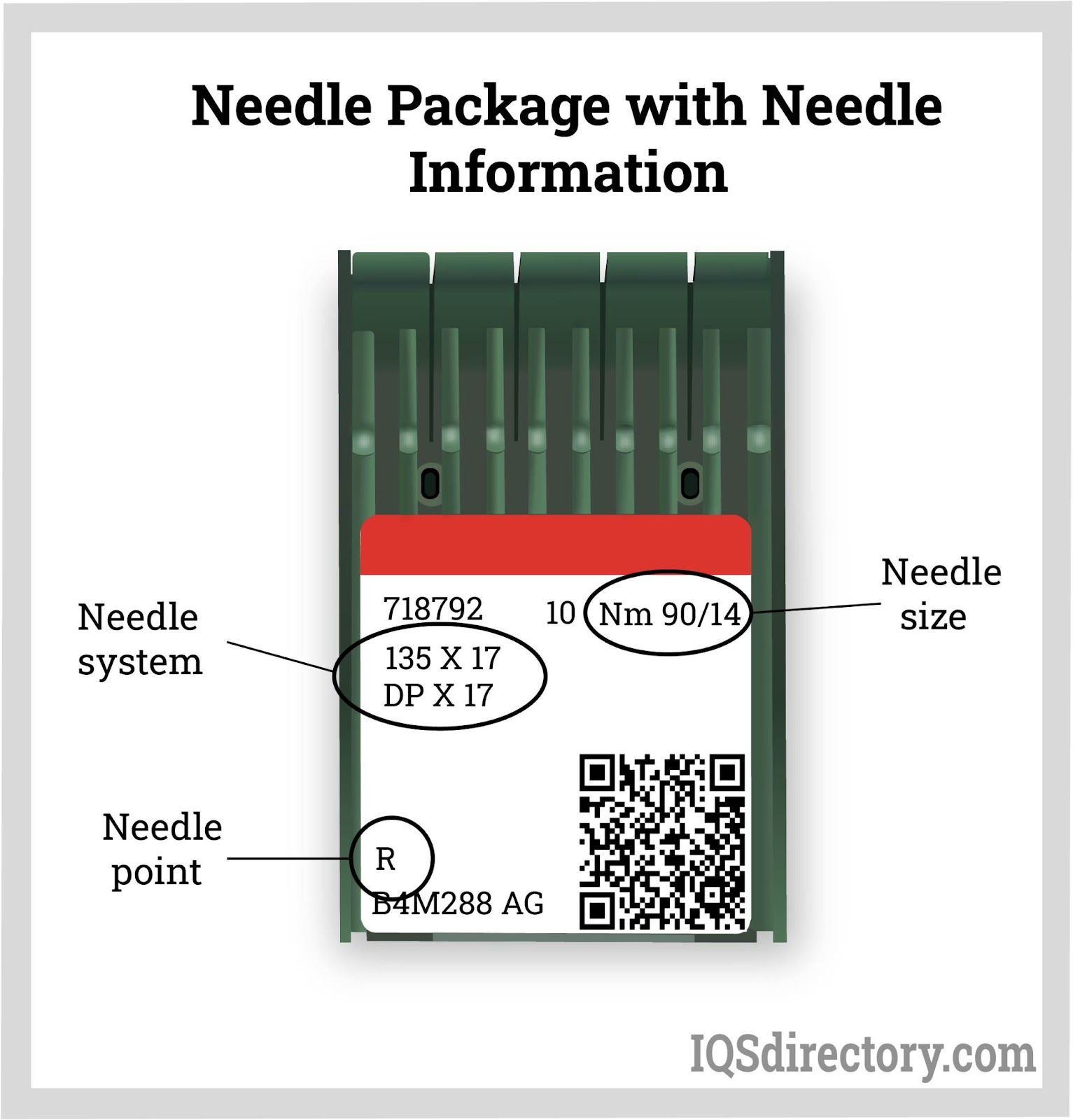 Needle systems are identified by a coding convention typically illustrated as two sets of numbers separated by "X" and are further declared on packaging with corresponding size and point specifics. The numeric sizes are available in both metric (35 to 250, corresponding to diameter in 1/100 mm) and US standards (6 to 28), formatted as NM metric size/US size (e.g., 110/18). Choice of a larger needle with an appropriate point type is essential for handling heavyweight or coated fabrics—ensuring consistent stitch penetration and integrity through multiple fabric plies.