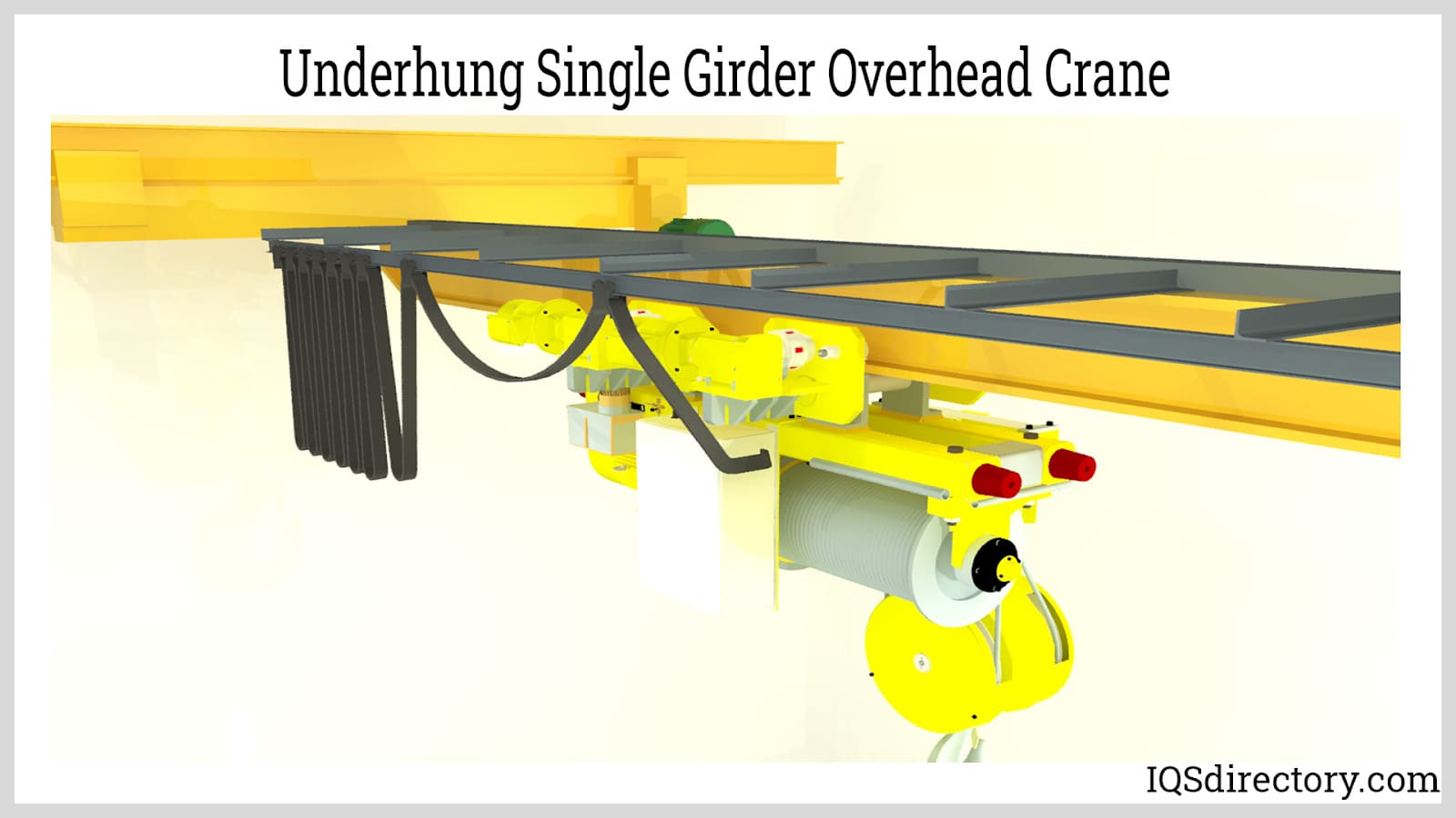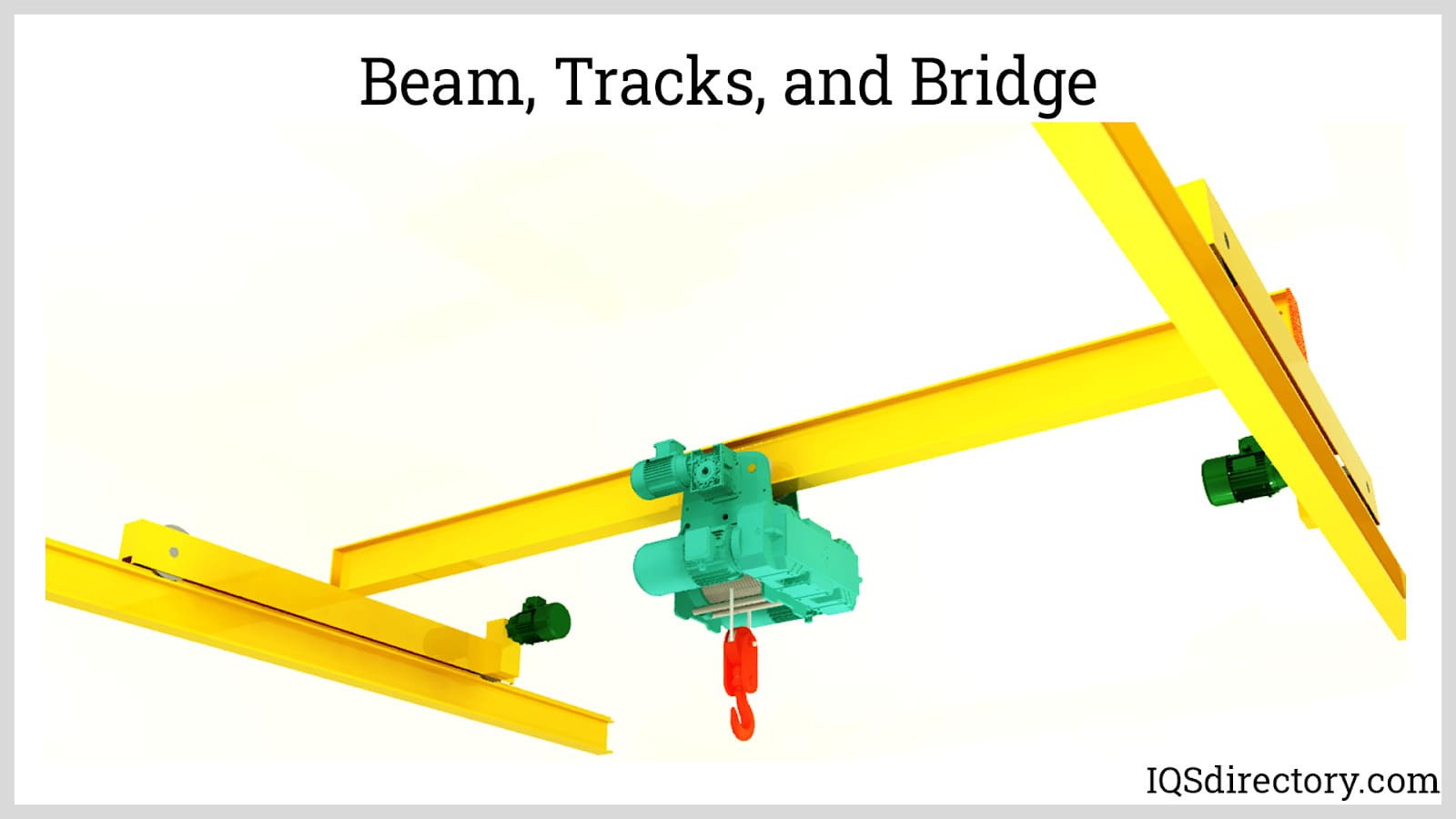 A bridge crane features two runways mounted on either side of a building and attached to its superstructure. These runways are linked by a bridge with end trucks that travel on wheels along the runways. The bridge can be configured as either single or double girder, with a trolley running on each type. The trolley and hoist are mounted underneath and move along the bottom of the bridge.