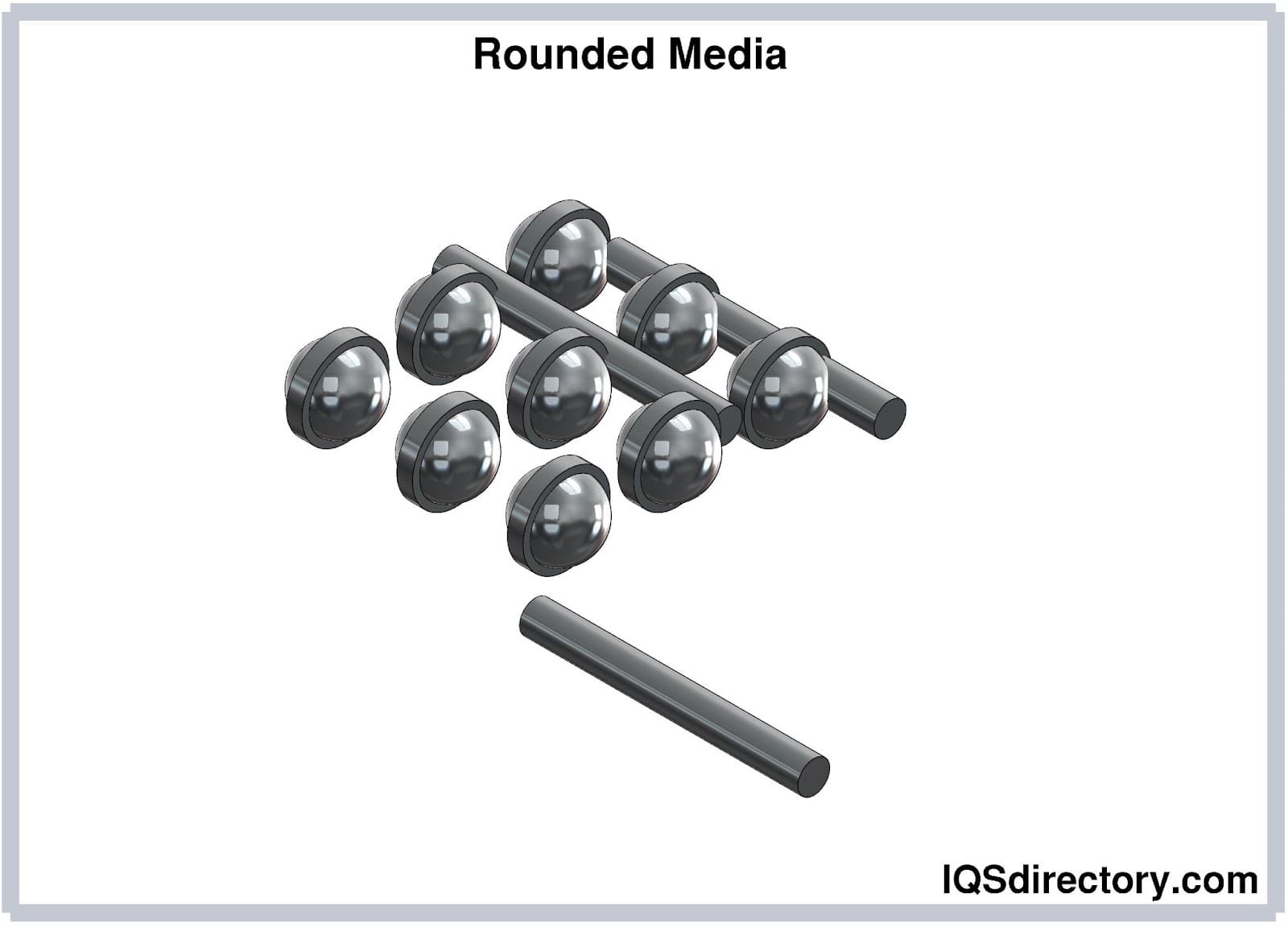 Rounded Media (spheres, oval, and cylinders) function ideally for light deburring, contaminant removal, and the finishing of smooth, contoured surfaces. Their smooth edges minimize the risk of part lodging, jamming, and media chipping, making them well-suited for parts with minimal recesses or undercuts.