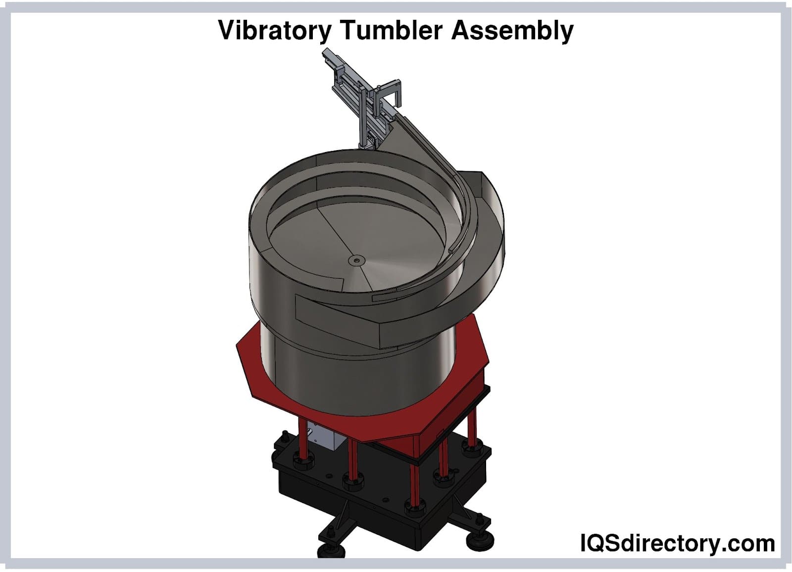 A vibratory tumbler is a machine used for finishing processes such as polishing, deburring, or cleaning. Workpieces are placed with media and sometimes chemicals, then agitated by vibration to grind and smooth surfaces without the components moving within the apparatus itself.
