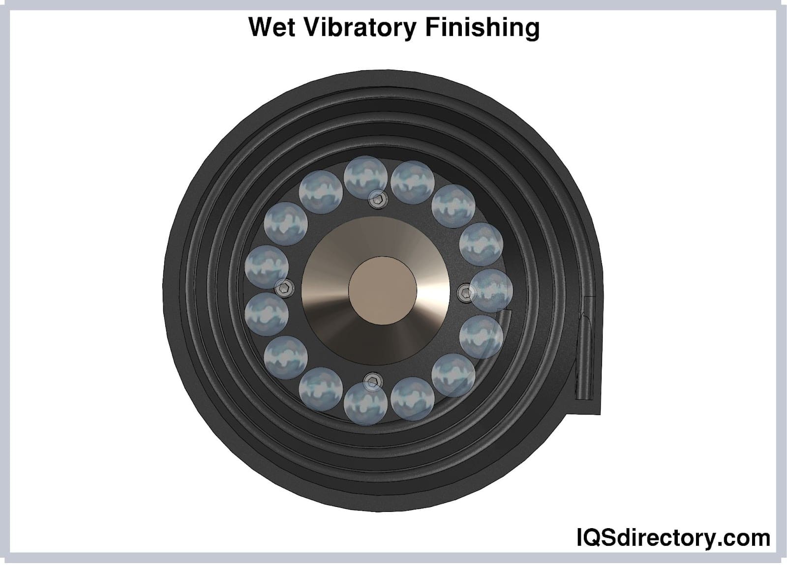 Wet vibratory finishing is a surface finishing process that uses a liquid solution—typically water combined with specialty finishing compounds—to assist in the tumbling process. The addition of fluids acts as a lubricant and coolant, reducing the heat generated from the rubbing of the abrasive media and workpiece. The processing liquid also helps remove oxides, grease, machining oil, and surface contamination, resulting in a cleaner and more highly polished part. The finishing media absorbs some of the solution, which minimizes workpiece distortion and reduces overall debris generation and redeposition on the media itself.