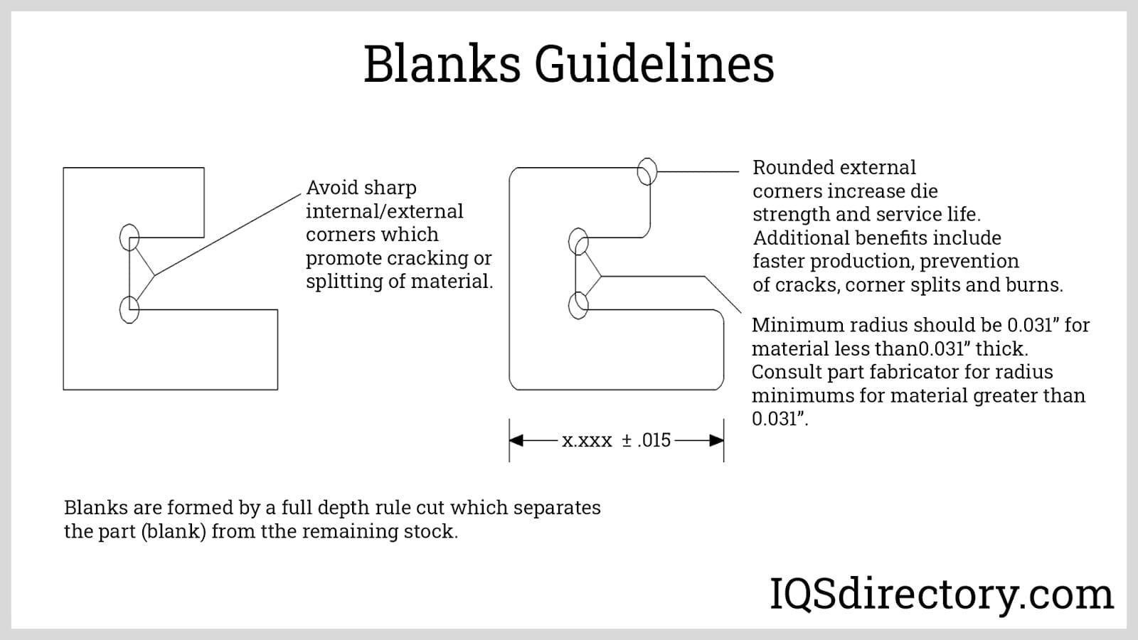 Blanks refer to the cuts that define the perimeter of the finished component. They play a crucial role in detaching the part from the base material during the stripping phase. To prevent issues, it's important to design the part and die to avoid sharp internal or external corners. These corners can act as stress points, which may lead to tearing or fractures, particularly in thin or delicate materials.