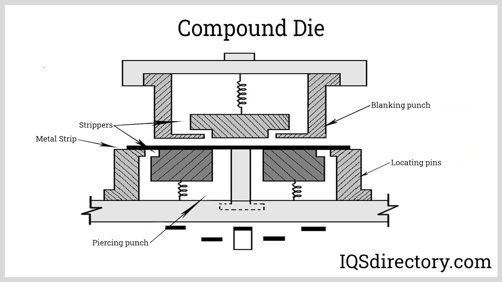 A compound die is engineered to carry out multiple cuts or impressions in just one operation, greatly improving production efficiency. An example includes the manufacture of flat washers, where the outer perimeter and interior hole are cut in a single press stroke. Compound dies combine durable steel rule sections for basic outlines with high-precision machined components for intricate contours. These dies are designed for slug removal, producing a finished blank instantly, and utilize integrated male and female tooling elements for clean, burr-free edges. This approach streamlines manufacturing and reduces the labor required for secondary finishing or sorting.