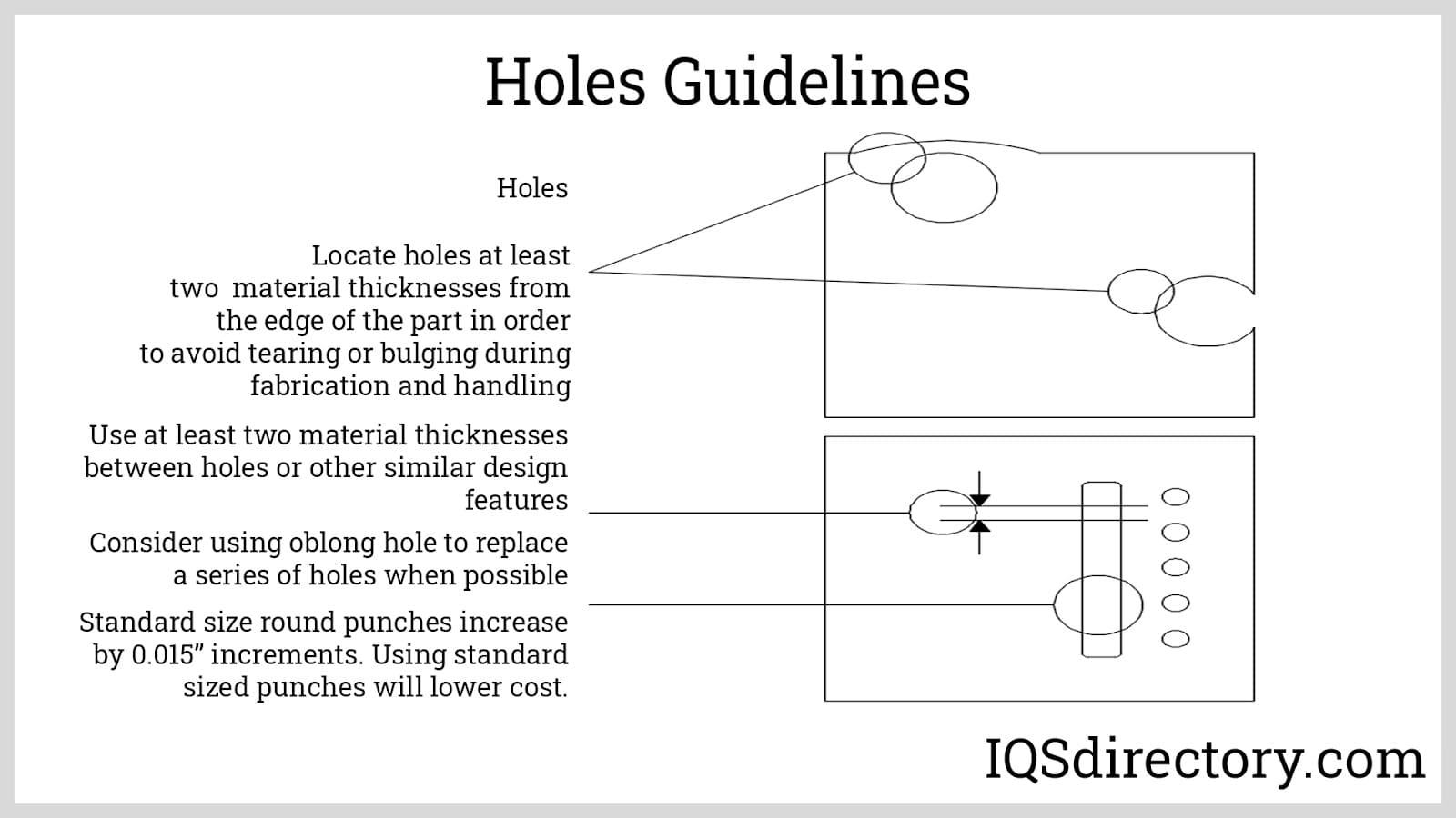 If a series of holes or other similar design features must be made, the clearance between two adjacent holes must be twice the material thickness. If possible, a single oblong hole may be considered to replace the series of holes.