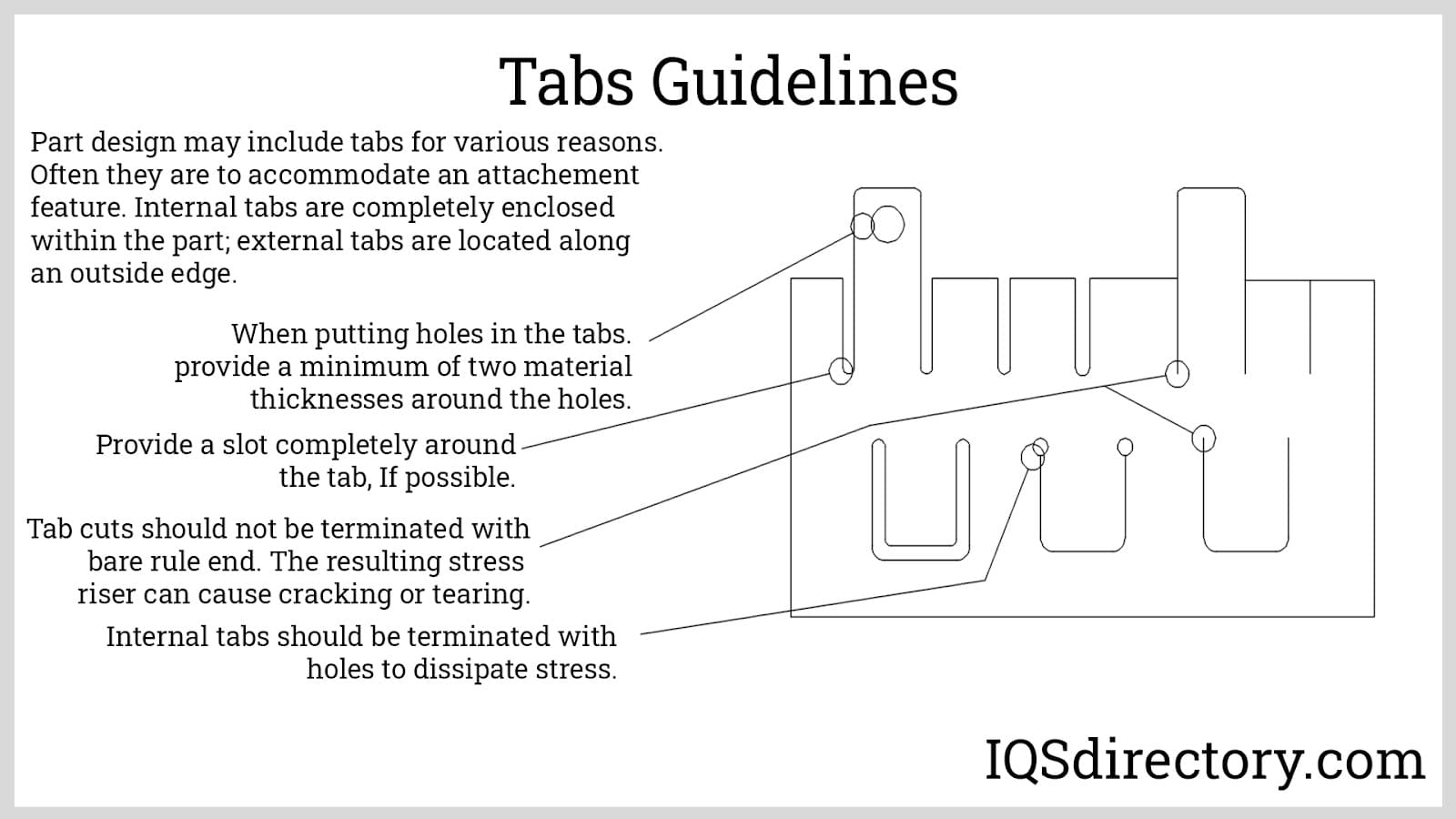 Tabs are incorporated into the design to secure corners and edges, adding a three-dimensional aspect to the stock material. Tabs can be positioned either outside the edge (external tabs) or within the plane (internal tabs).